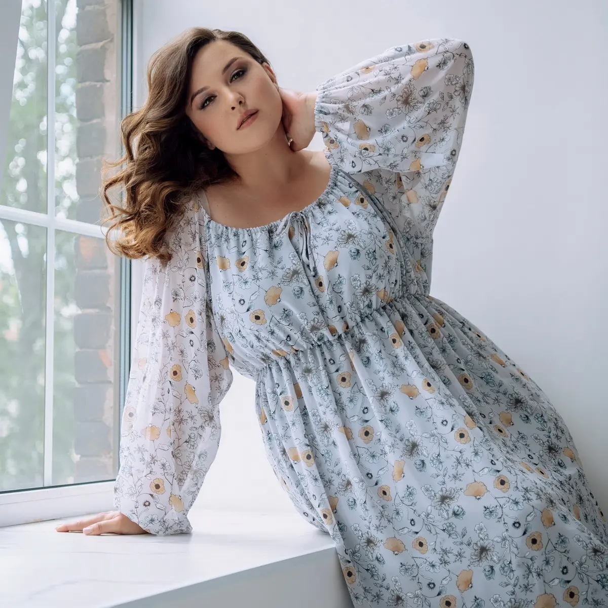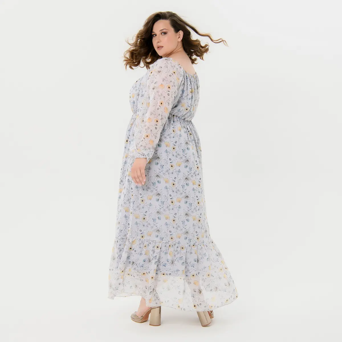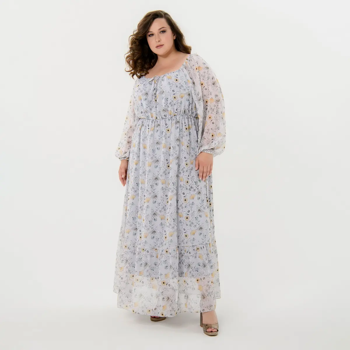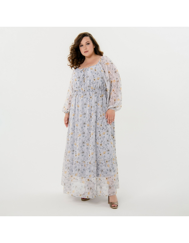Романтичное, длинное платье из шифона свободного силуэта. Отрезное под линией груди. Вырез горловины расширенный, на резинке. Рукав на основе реглан, длинный, свободный, по низу на резинке. По низу платья оборка.