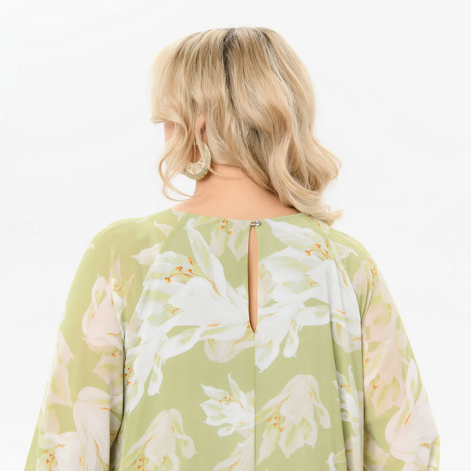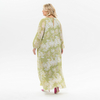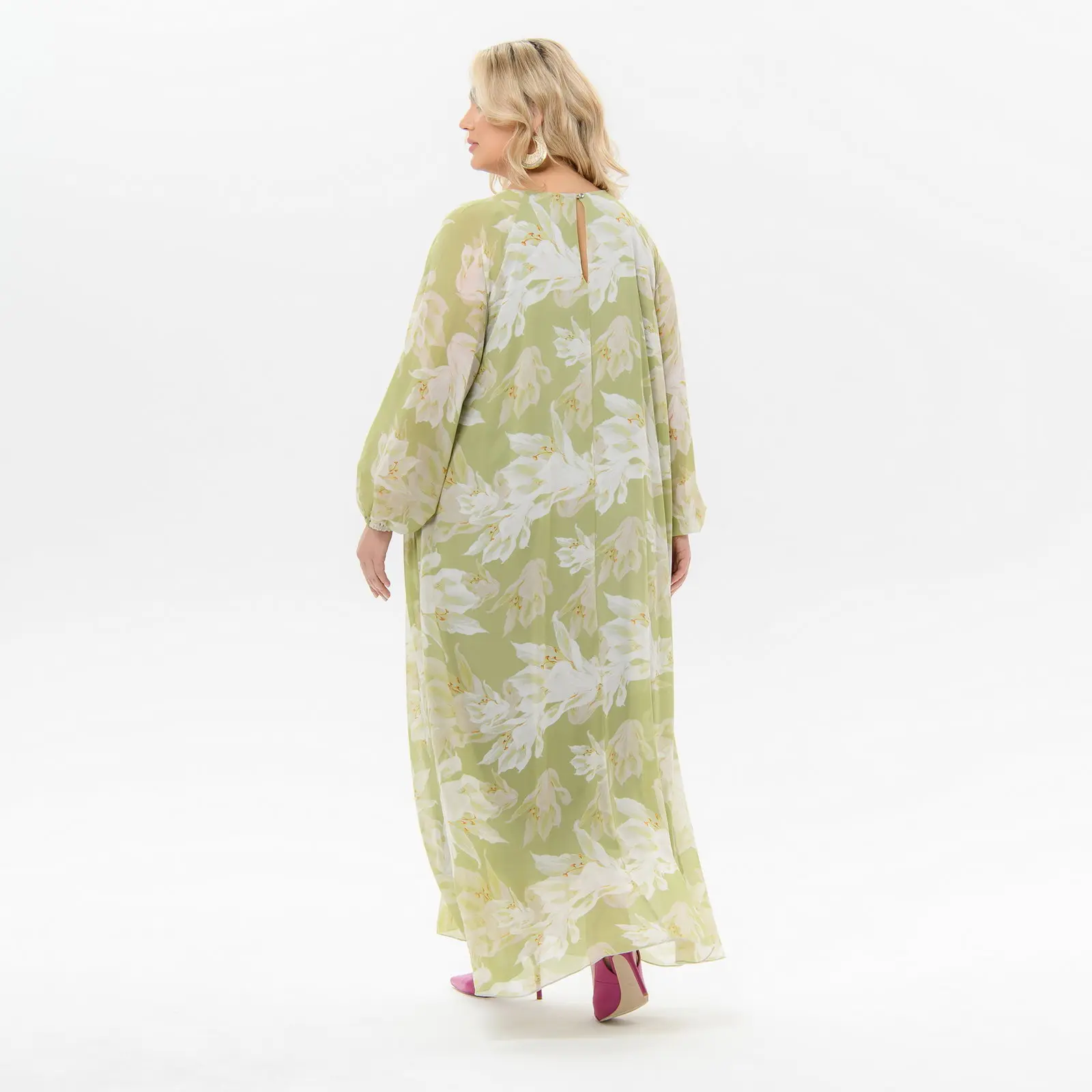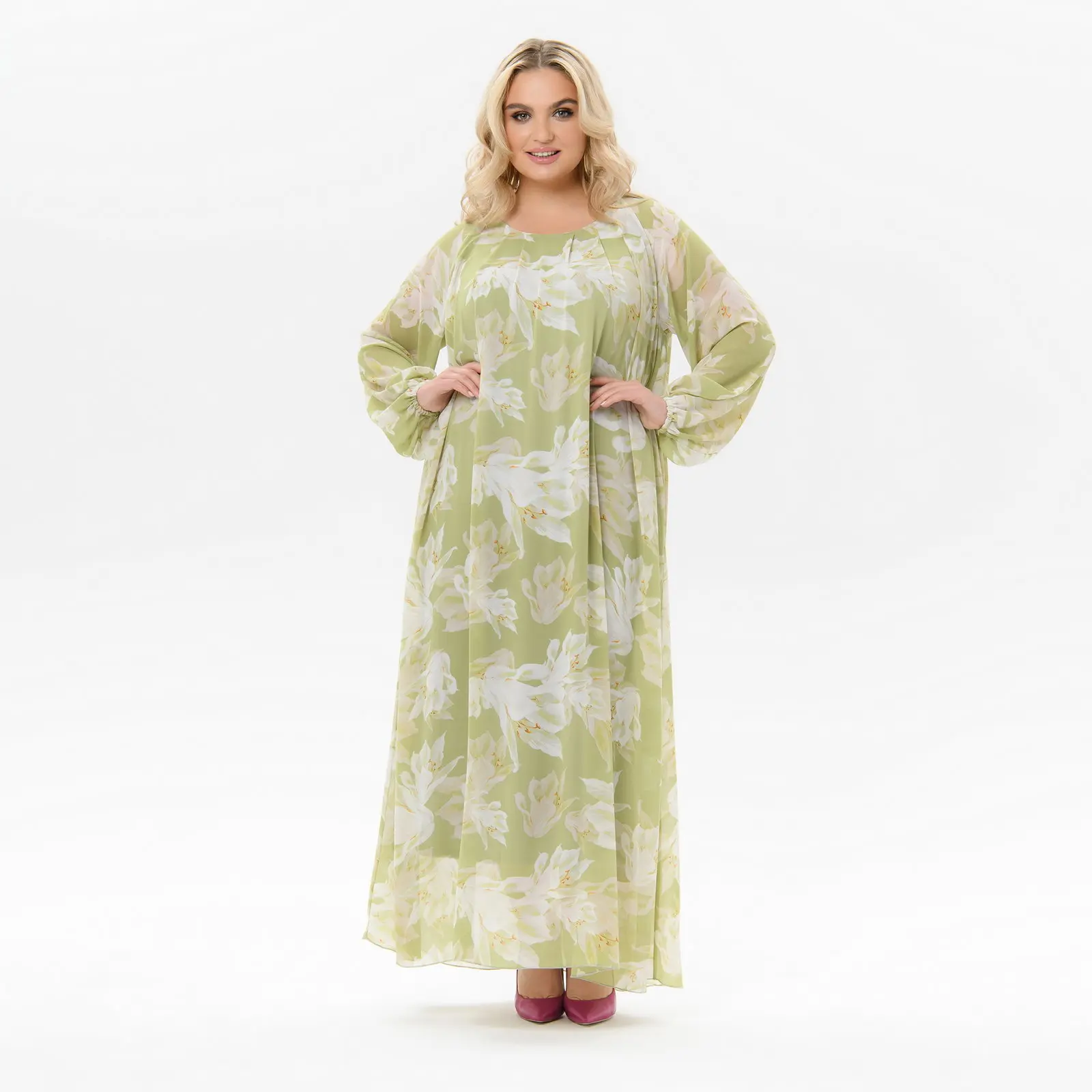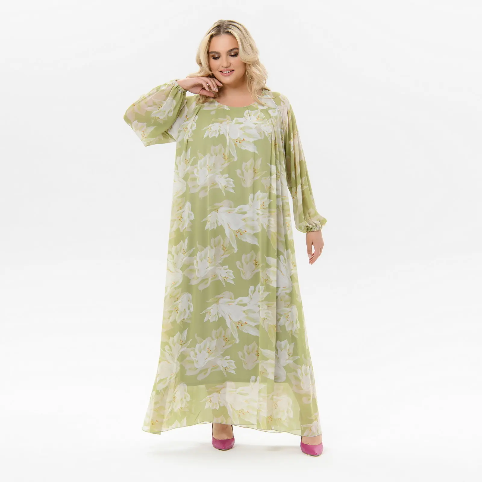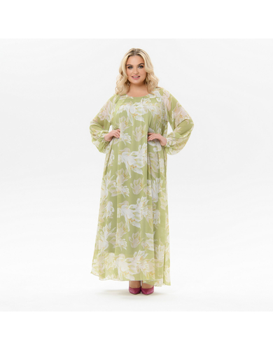 Длинное струящееся платье с рукавом реглан. Модель выполнена из шифона, на подкладке из эластичного трикотажа. Горловина округлая с мягкими складками по переду, по спинке вырез "капелька", застегивающийся на пуговицу.
