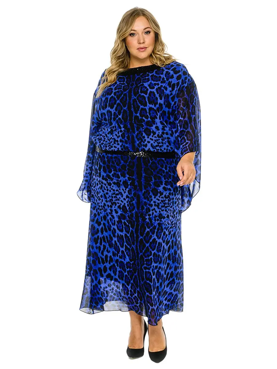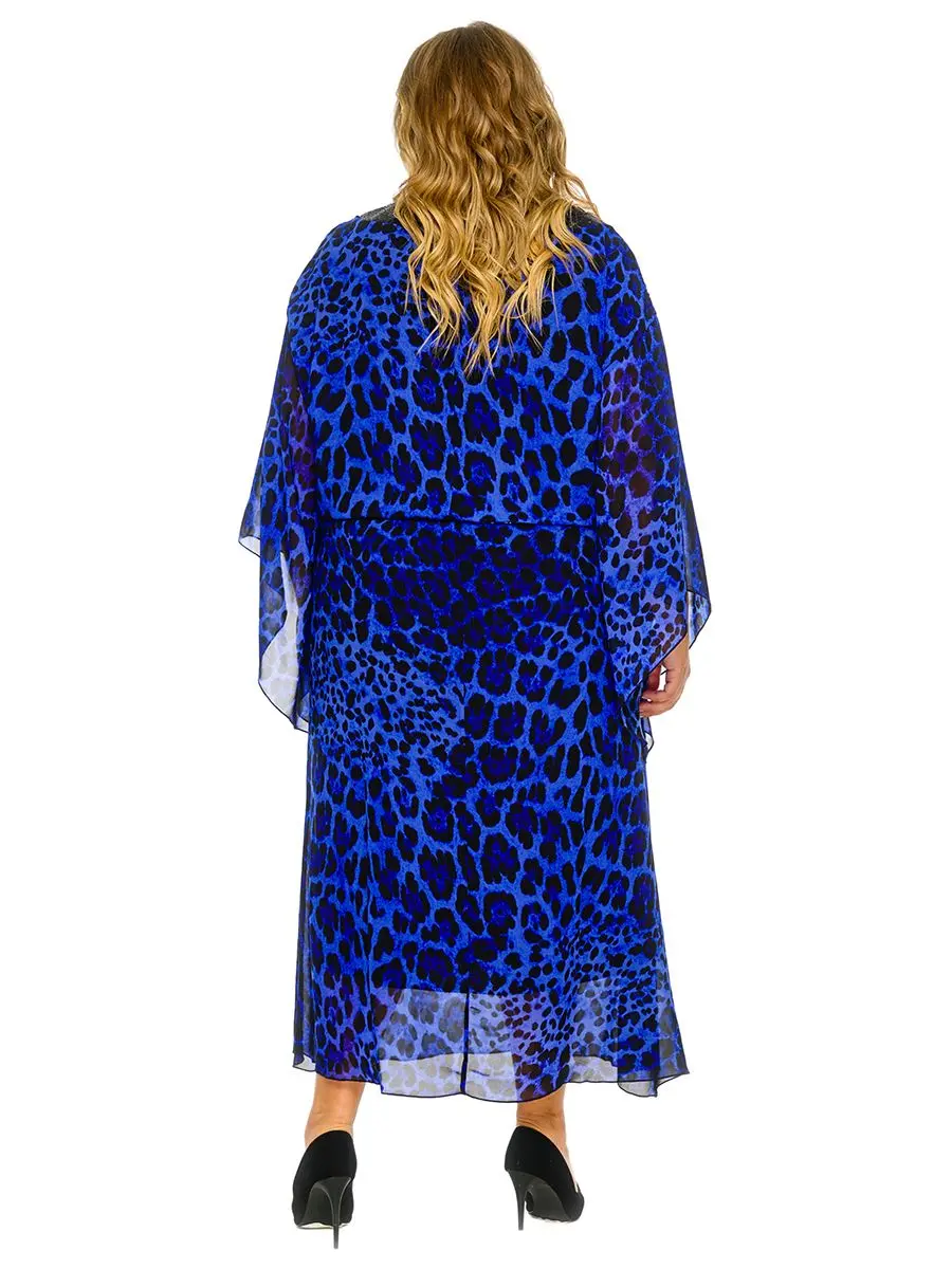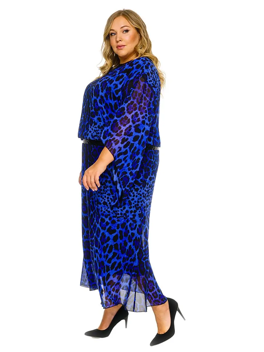 Платье вечернее из шифона принт синий леопард, пояс и горловина из пайеток