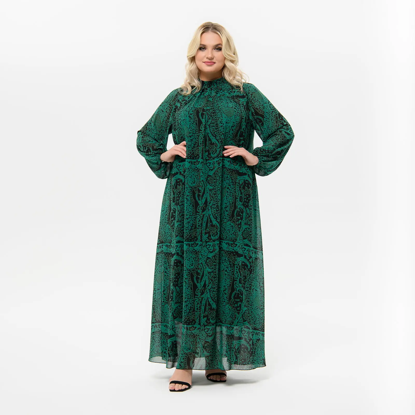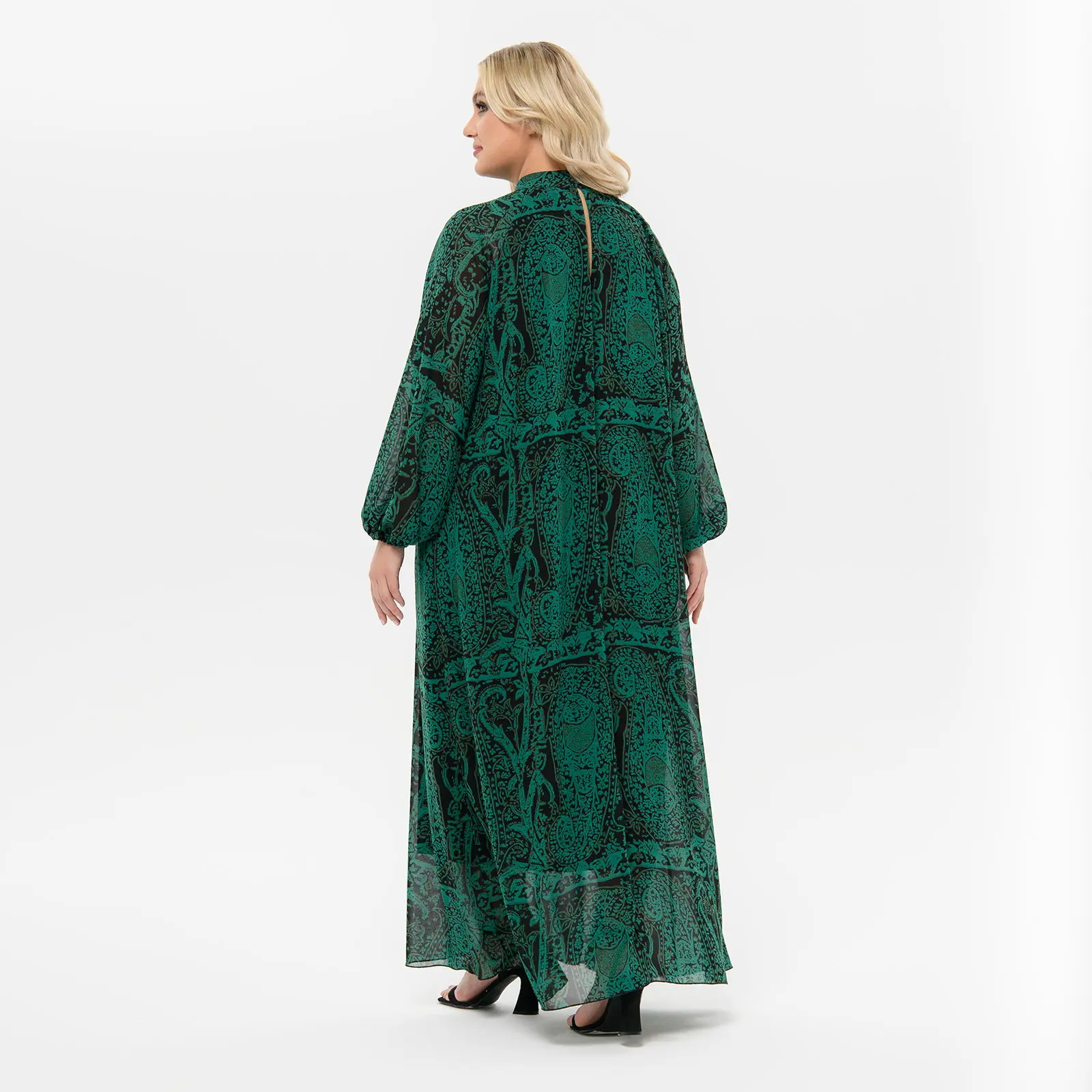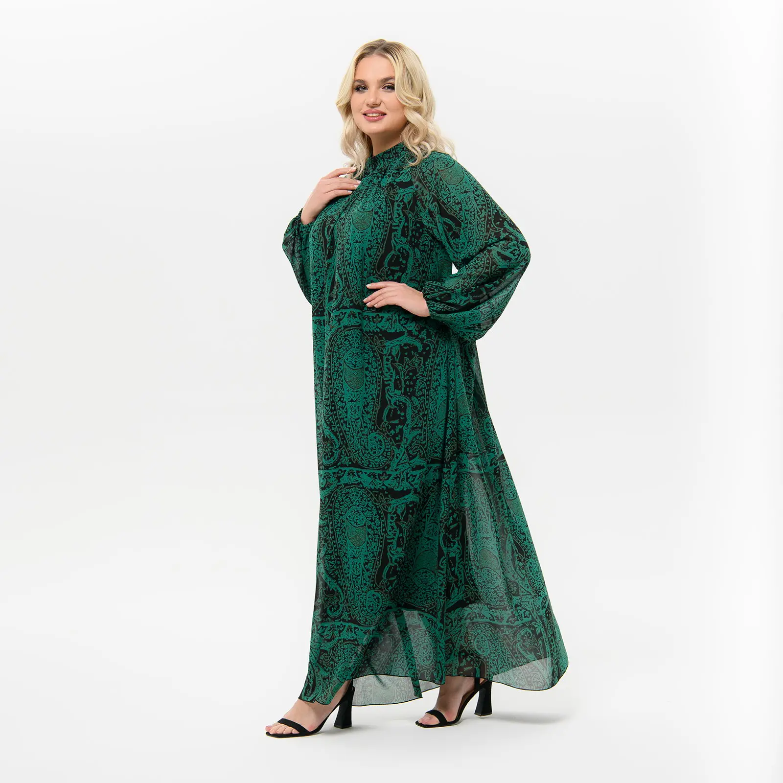 Платье из шифона с воротником "стоечка", принт изумрудный