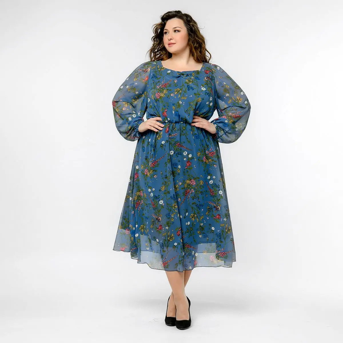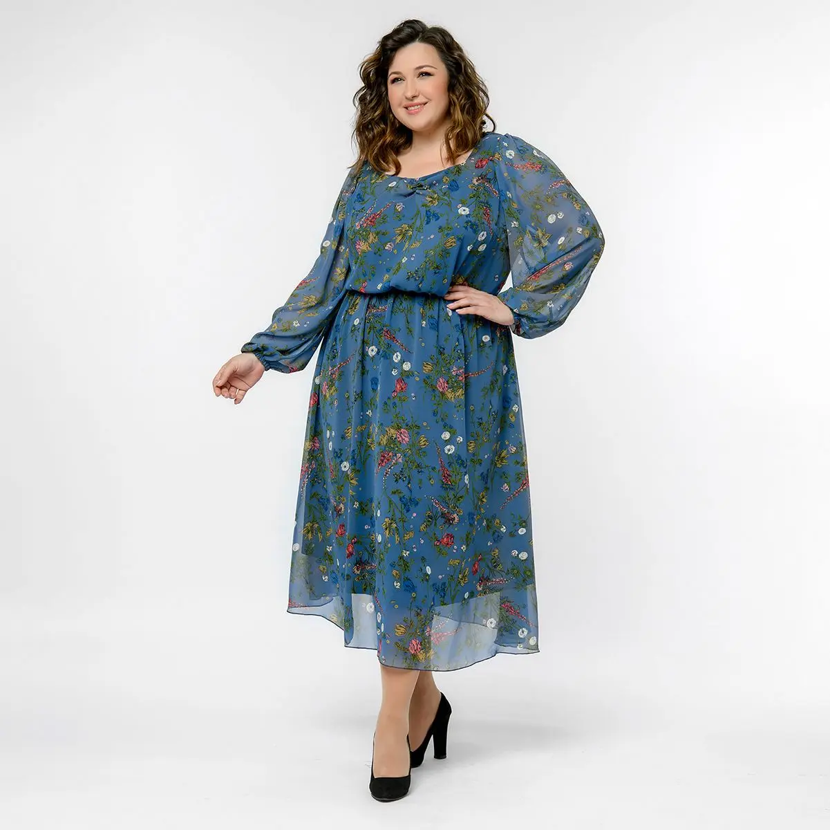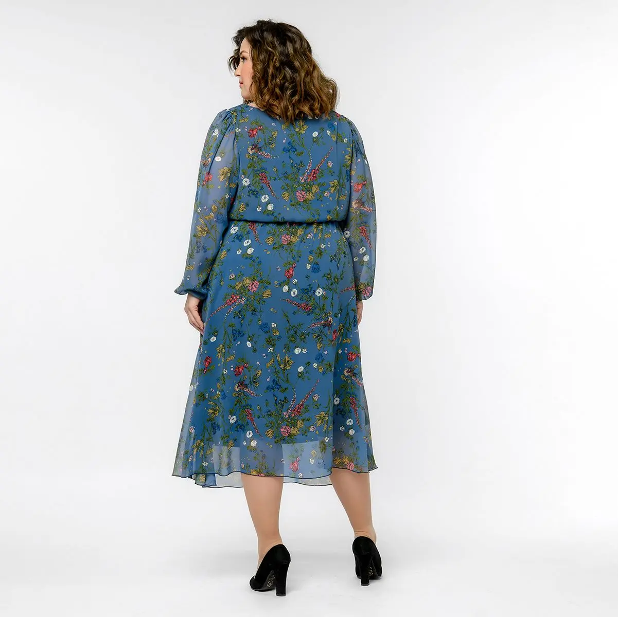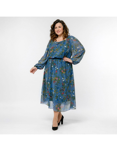 Романтичное платье из шифона с длиной миди. По горловине переда фигурный вырез. По центру переда легкая сборочка.