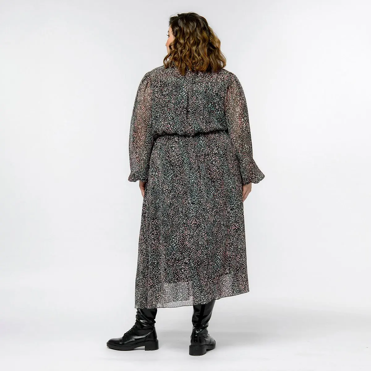 Платье из шифона с воротником "стоечка", мелкий принт на черном