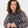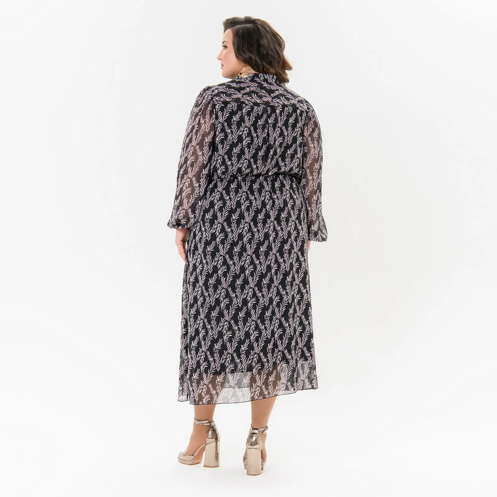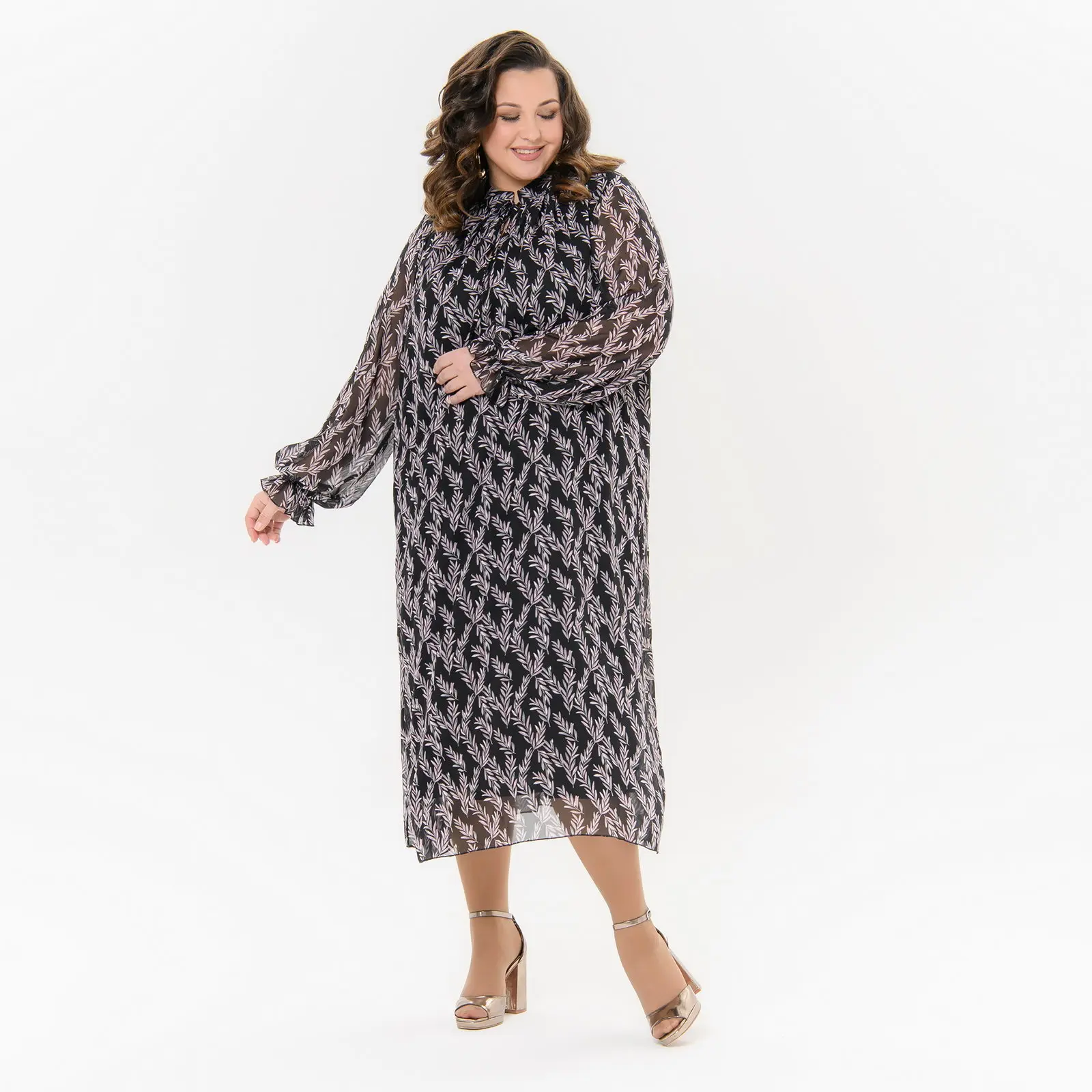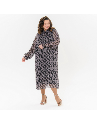 > Платье А-силуэта, миди, шифон черный, принт "веточки"