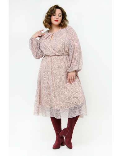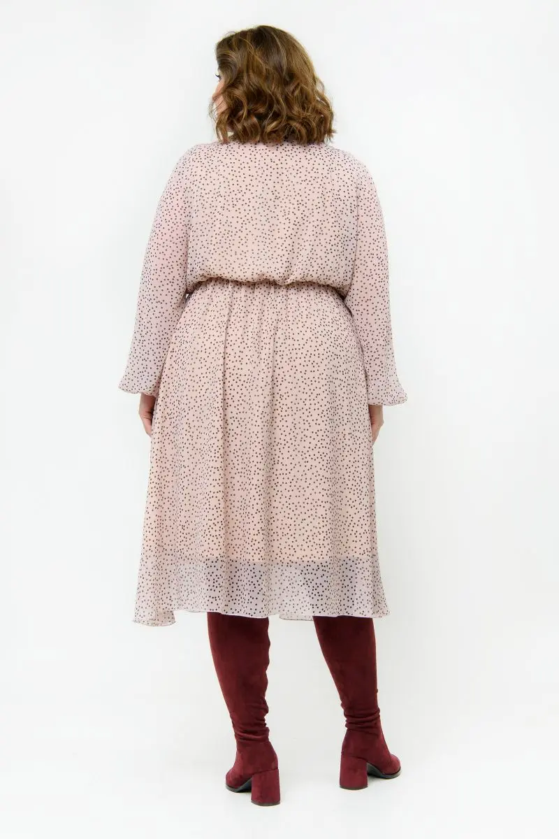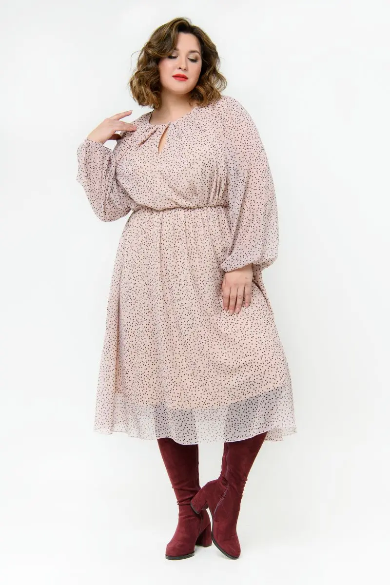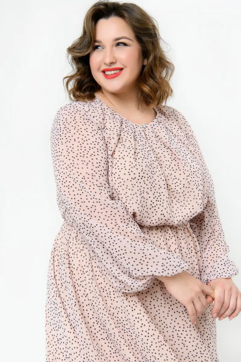Платье с мягкими защипами по горловине, шифон пудровый в черный горошек