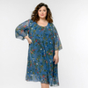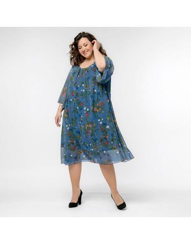 Воздушное платье силуэта трапеция из шифона с расклешенным рукавом. По горловине переда заложены защипы.