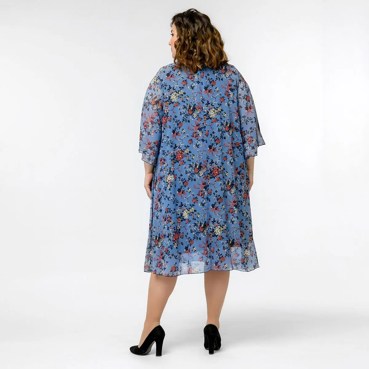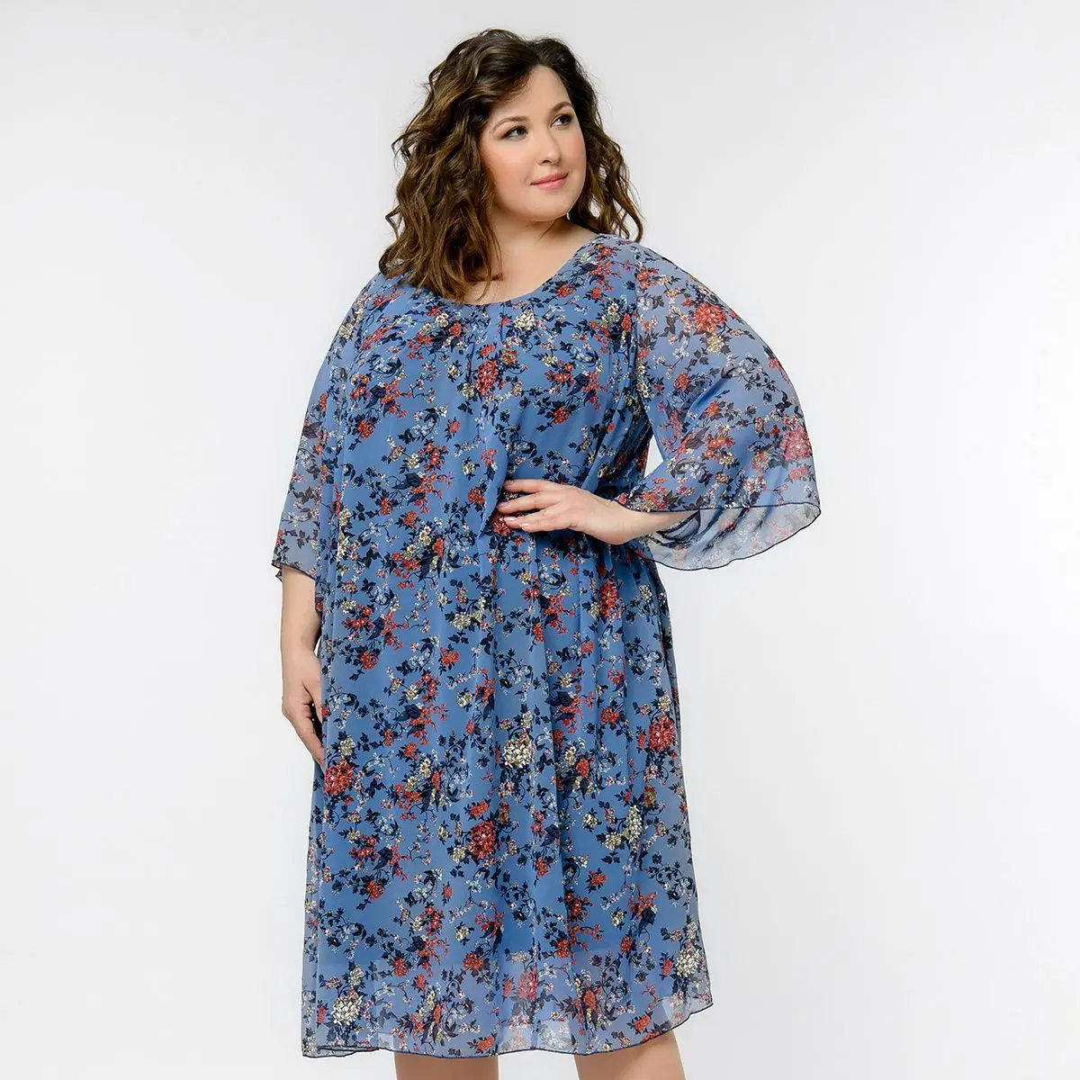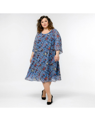 Воздушное платье силуэта трапеция из шифона с расклешенным рукавом. По горловине переда заложены защипы.