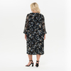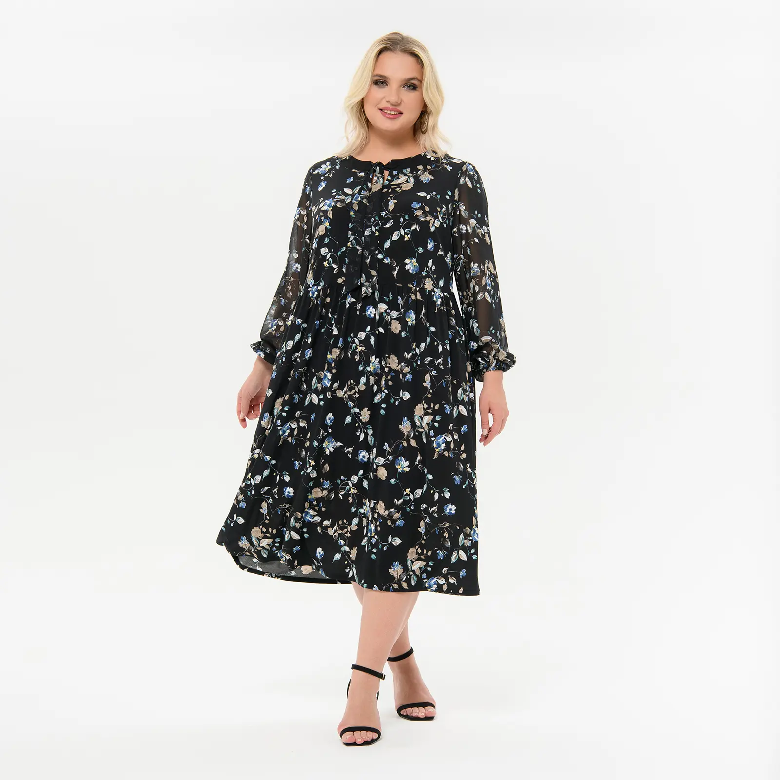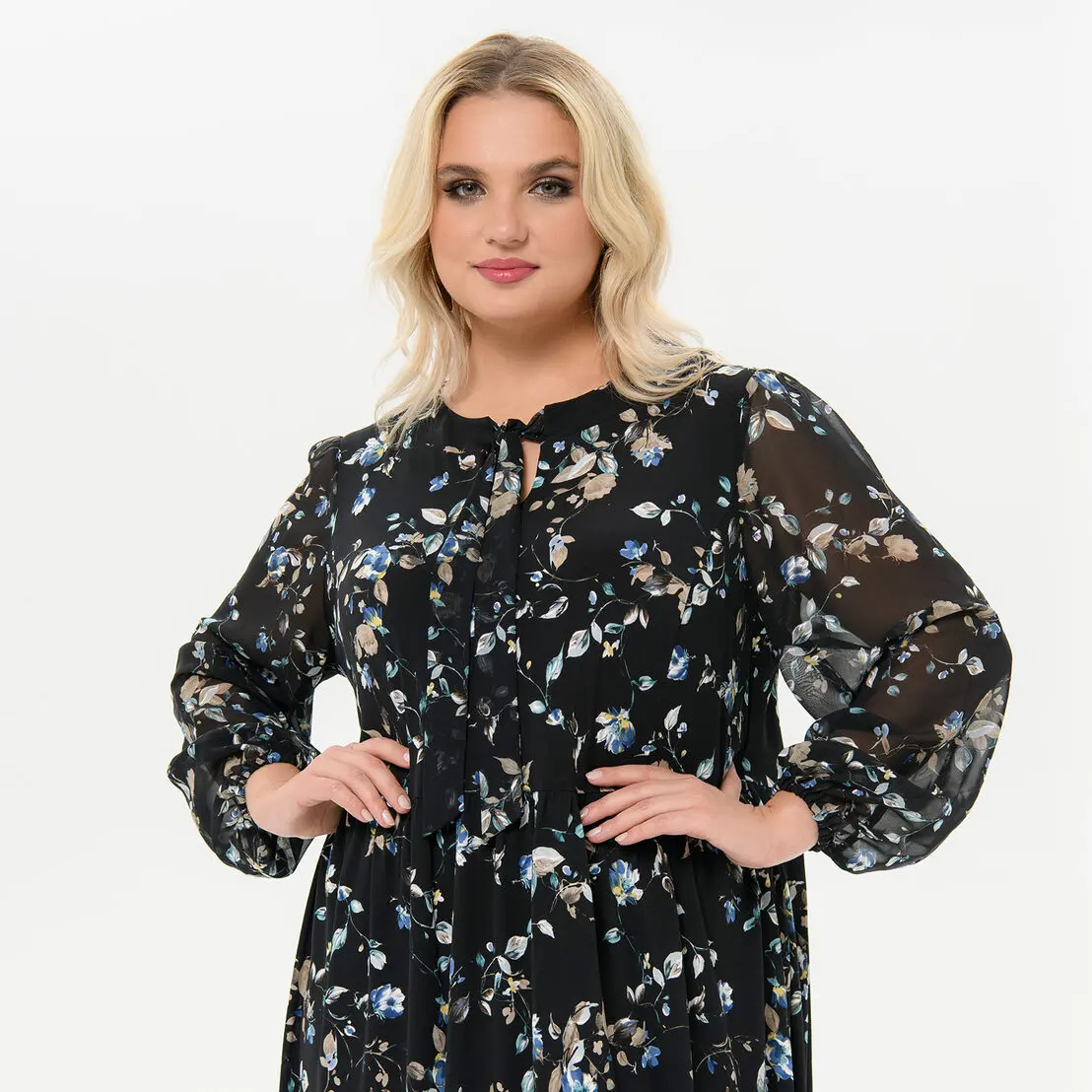 Платье комбинированное, основа "масло", рукава шифон-компаньон, черное с бирюзовыми цветами