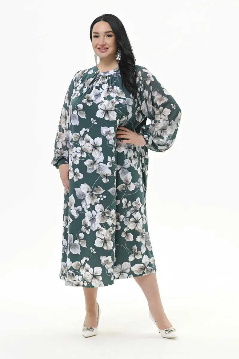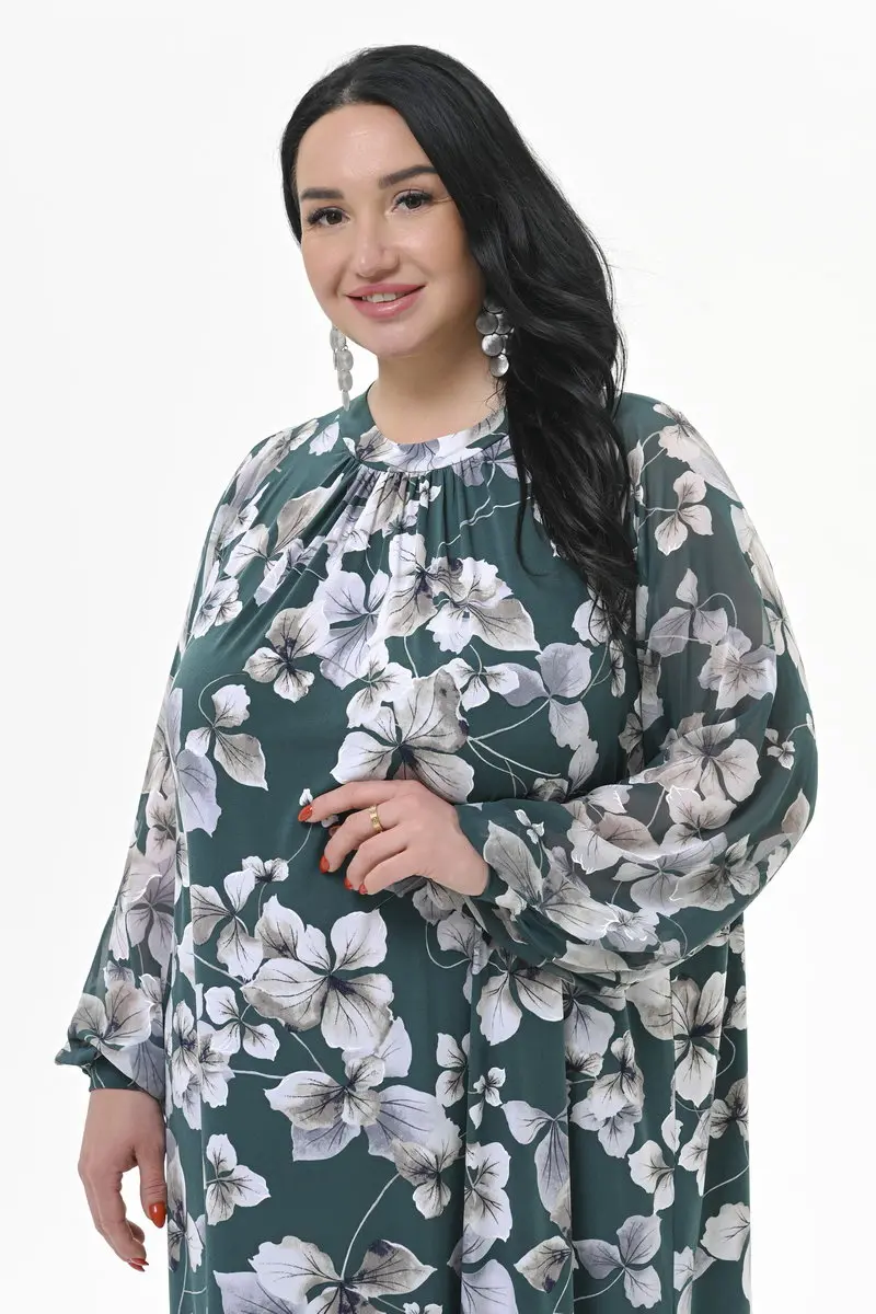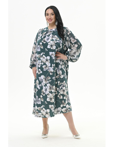 > Платье комбинированное, масло/шифон, изумрудное, принт цветочный