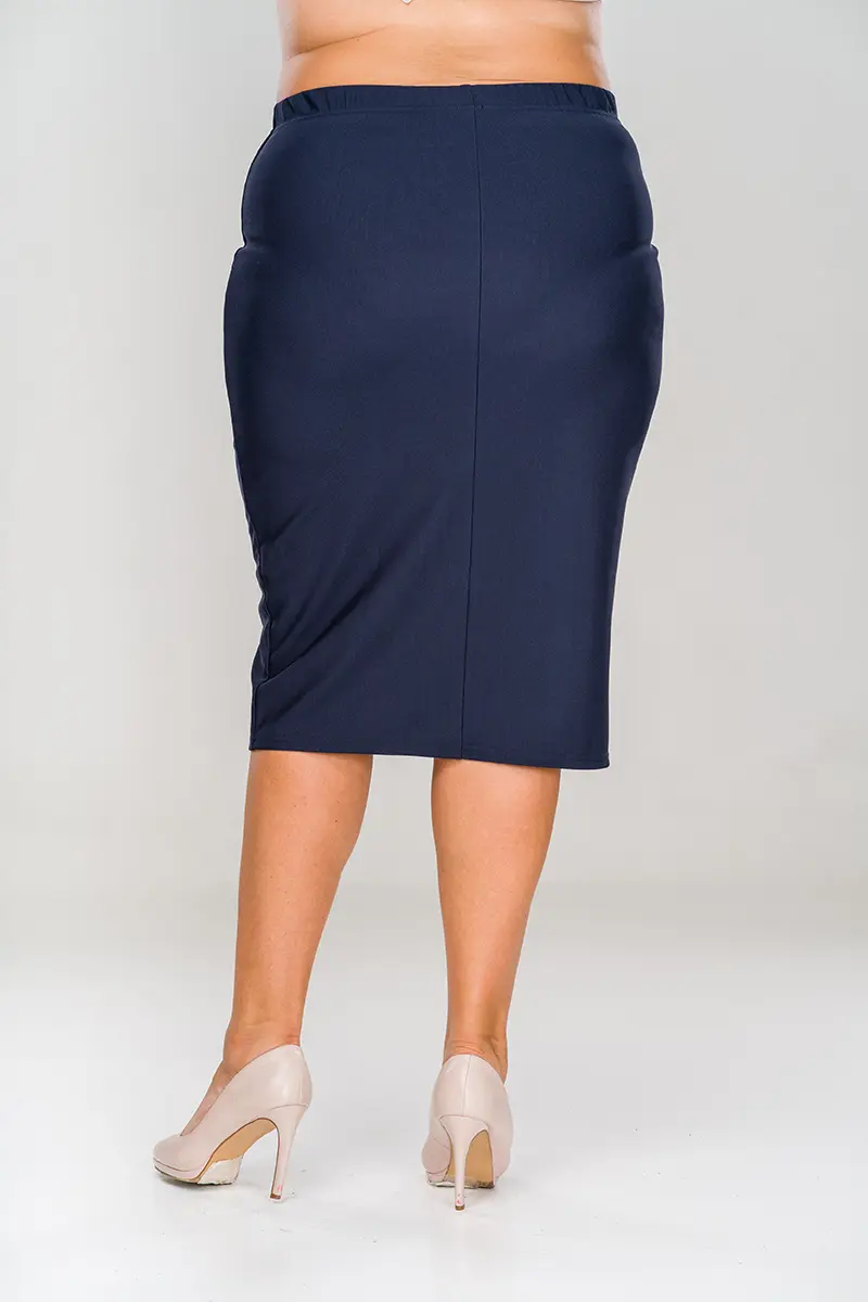 Классическая юбка, зауженная к низу из джерси. На уровне левого рельефа вставка из искусственной кожи, зрительно вытягивающая силуэт. Эта юбка выгодно подчеркнет длину Ваших ног.