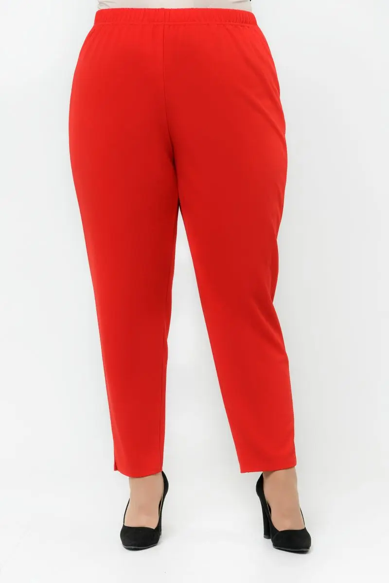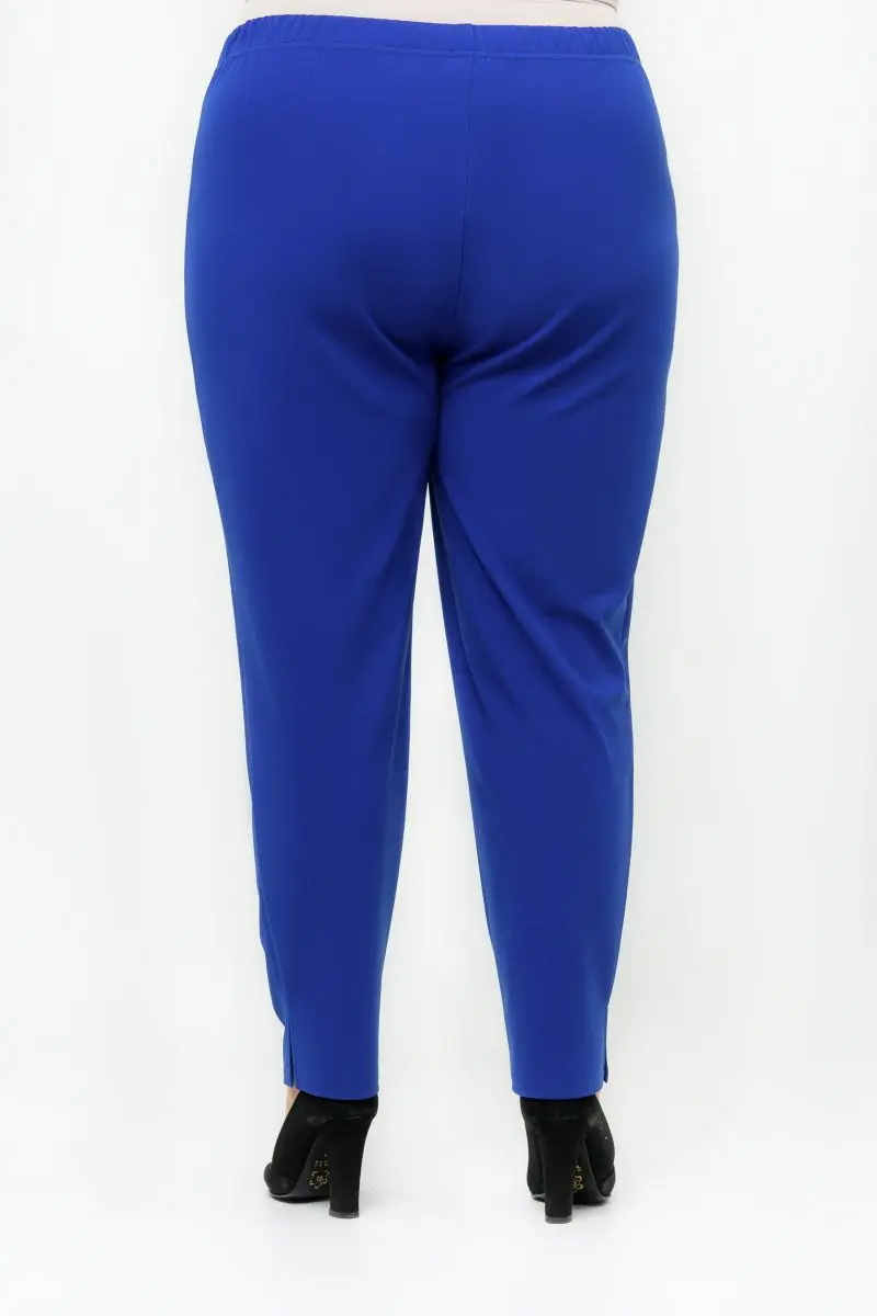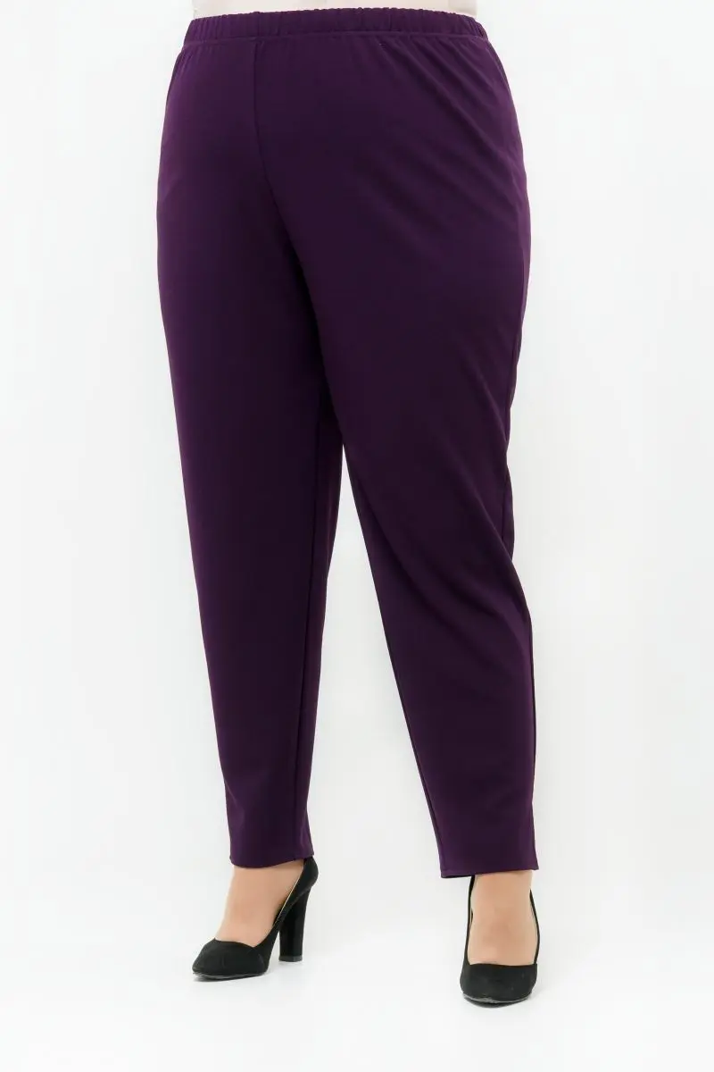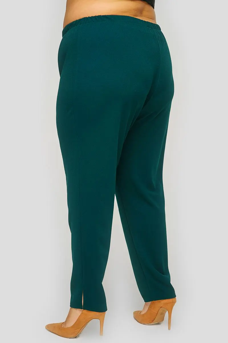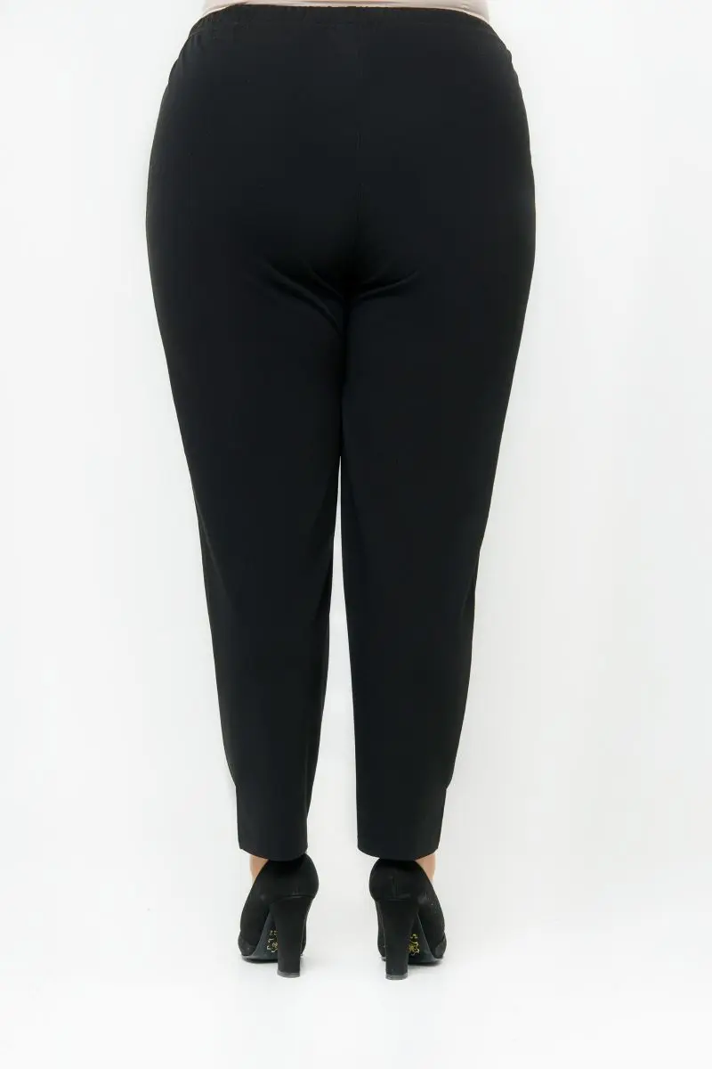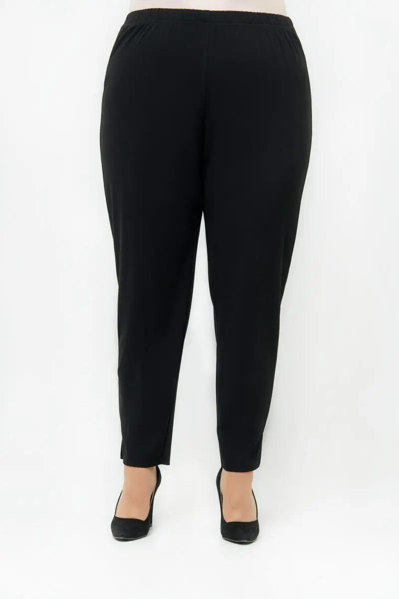 Брюки зауженные из крепа с эластаном, длиной 7/8. Верх на резинке, по низу боковых швов - разрезы. Ткань - креп с эластаном; состав: вискоза - 65%, полиэстер - 25%, эластан - 10%. Длина изделия от 105 см по боковому шву.