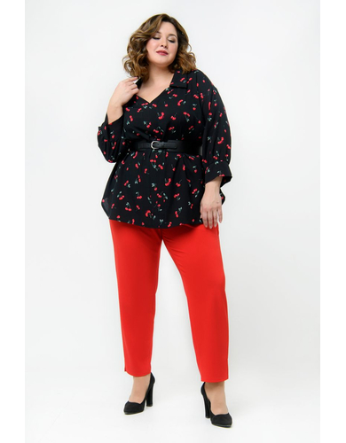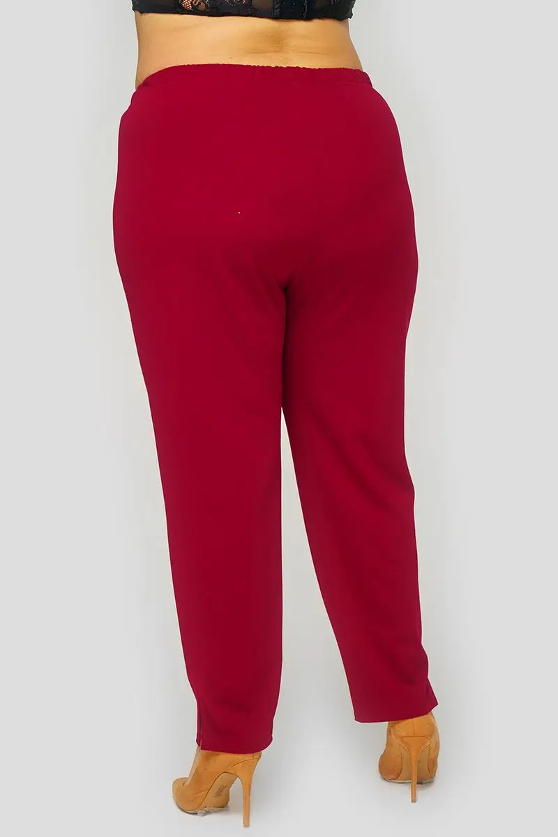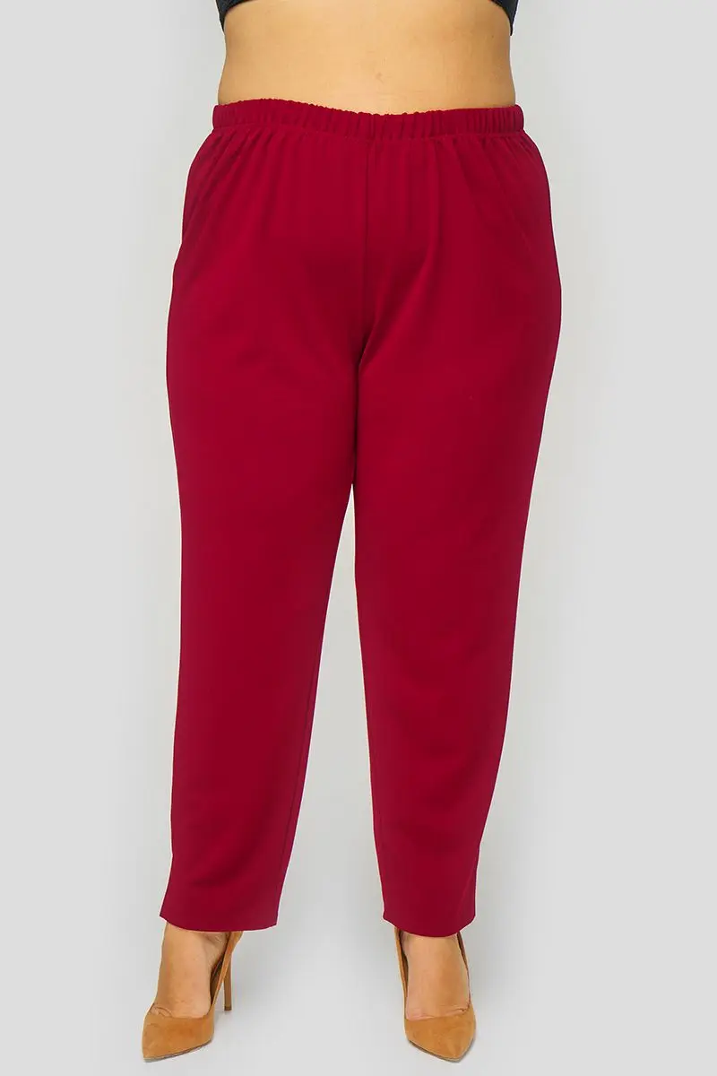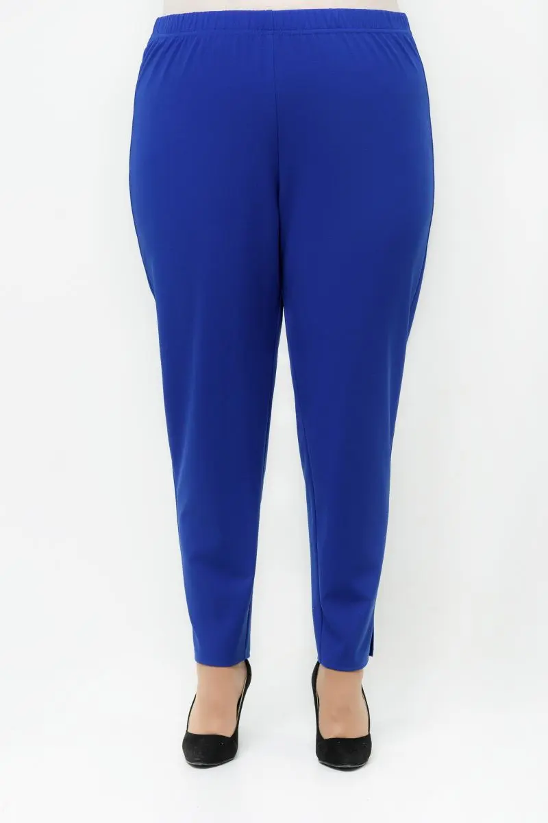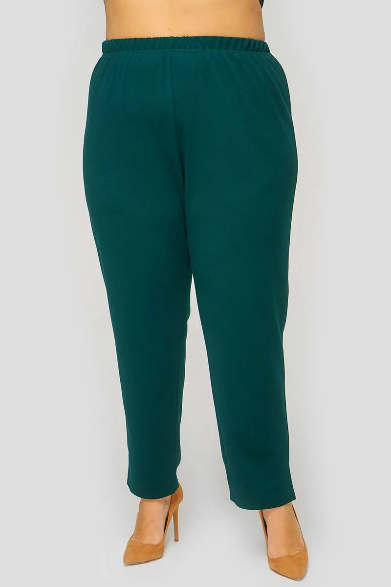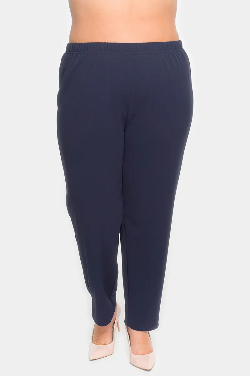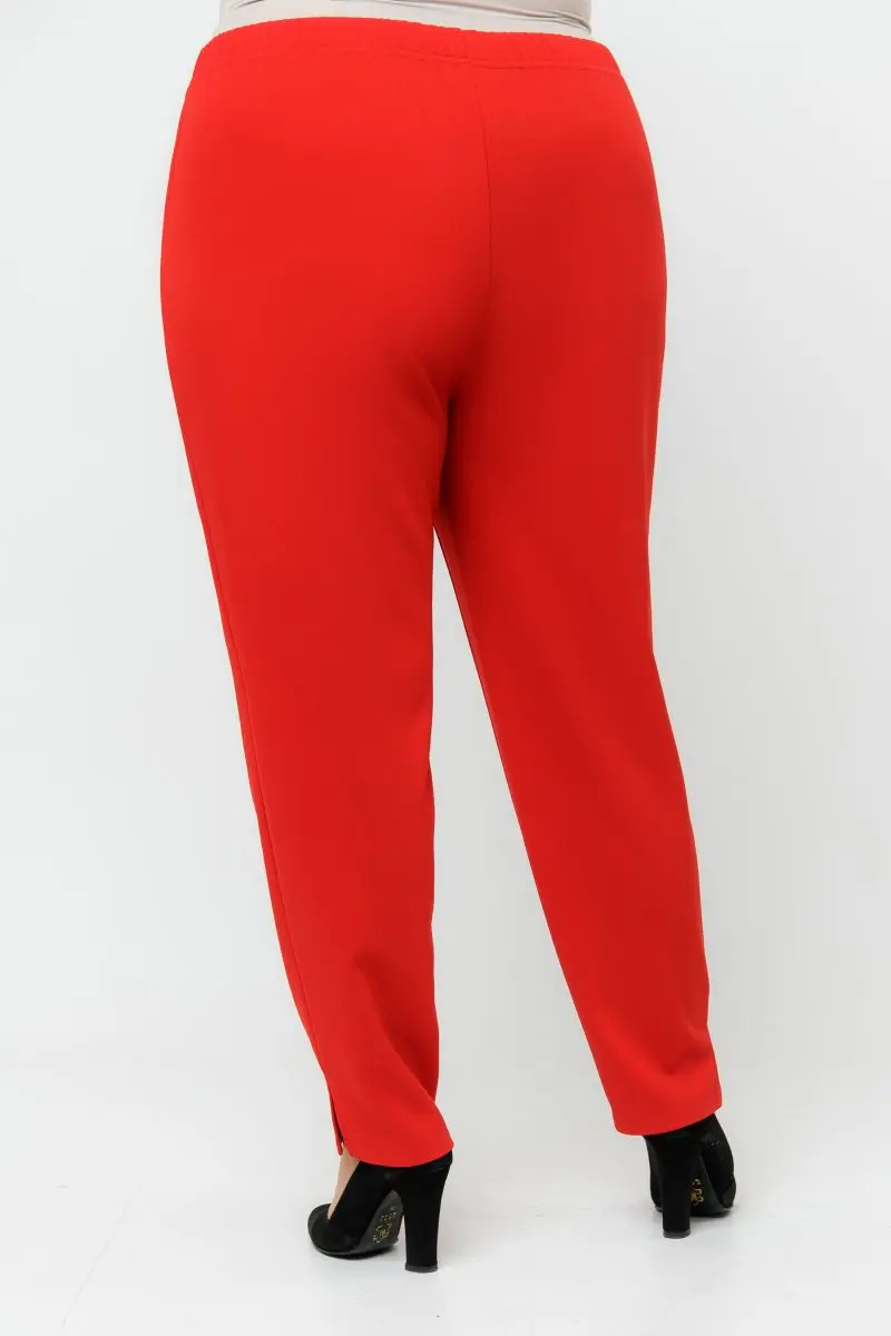 Брюки зауженные из крепа с эластаном, длиной 7/8. Верх на резинке, по низу боковых швов - разрезы. Ткань - креп с эластаном; состав: вискоза - 65%, полиэстер - 25%, эластан - 10%. Длина изделия от 105 см по боковому шву.