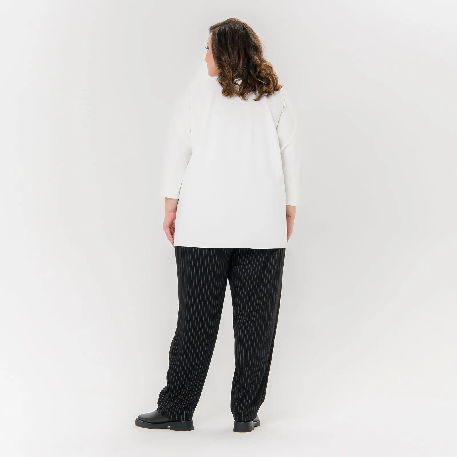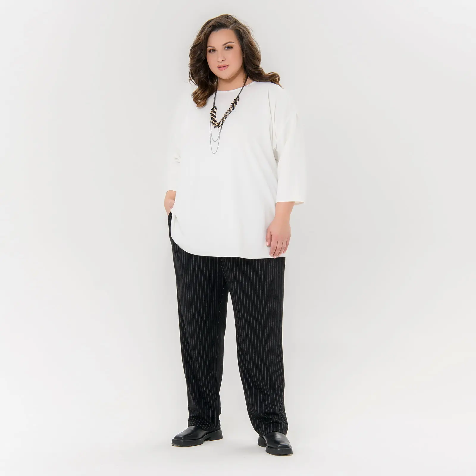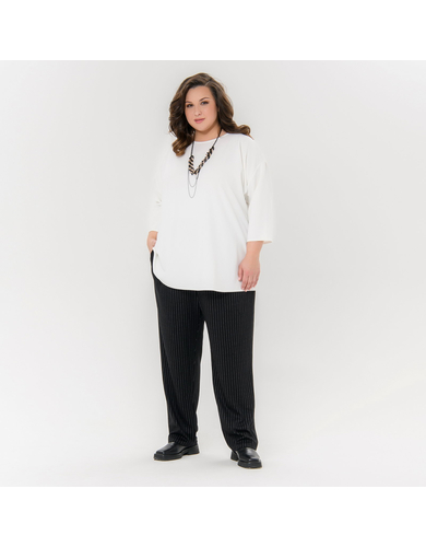Брюки классического покроя из джерси, в полоску. Брюки с карманами. По верху передней половинки заложены мягкие защипы. По верхнему срезу брюк притачной пояс: гладкий по переду и на резинке по спинке. Посадка высокая. Ткань - джерси. Состав: 65% вискоза, 30% полиэстер; 5% эластан. Цвет - черный. Длина изделия от 108 см по боковому шву вместе с поясом.. Рост модели 172 см. На модели представлен 62 размер.