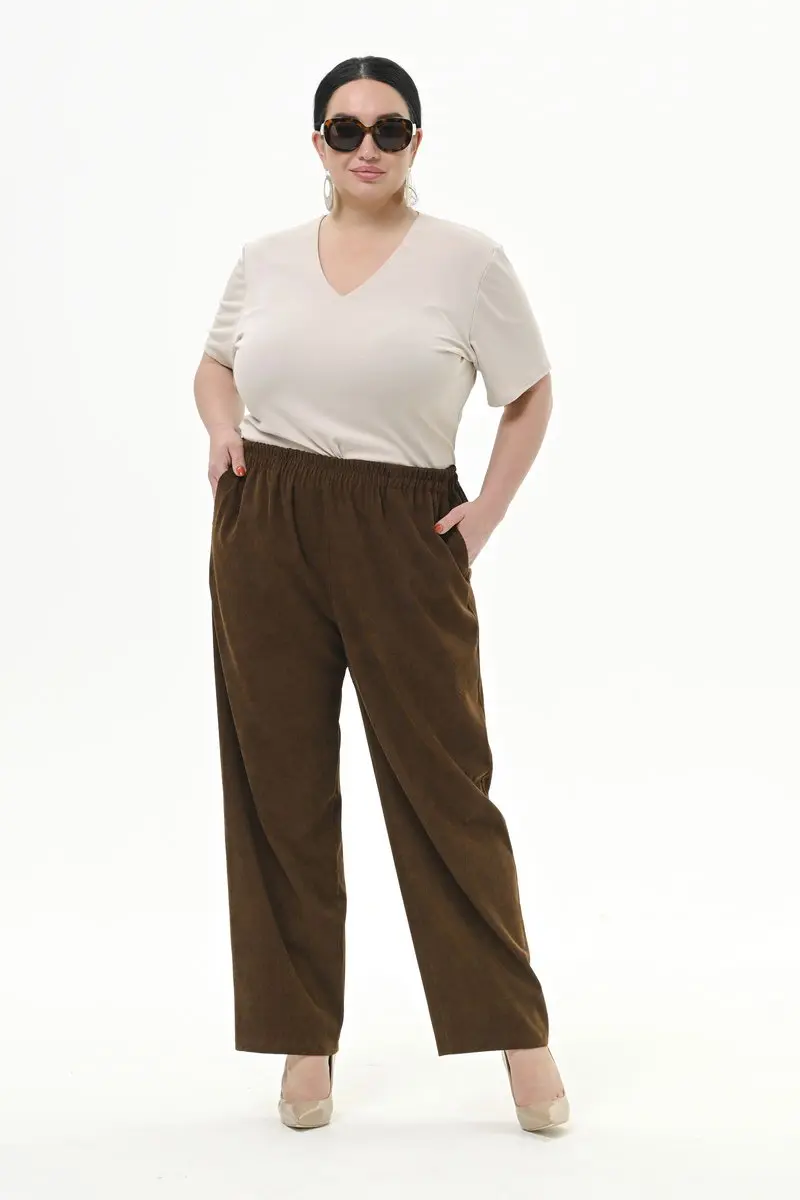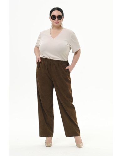 Прямые брюки из вельвета. В боковых швах карманы. Верх на резинке шириной 3,5 см Ткань - 80% полиэстер, 20% хлопок. Цвет - "молочный шоколад". Длина изделия от 104 см по боковому шву (вместе с резинкой). Рост модели 172 см. На модели представлен 58 размер.