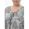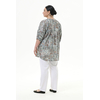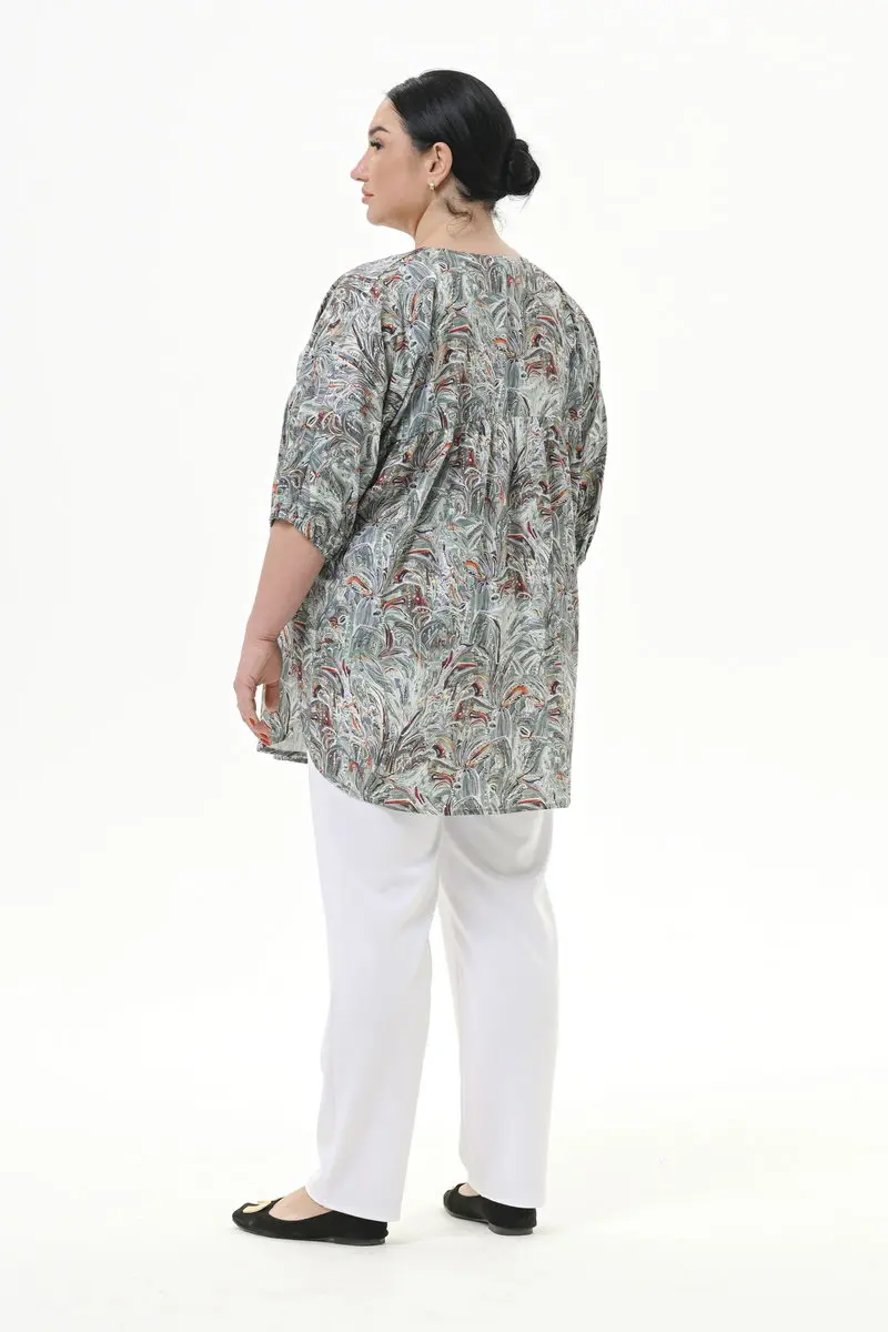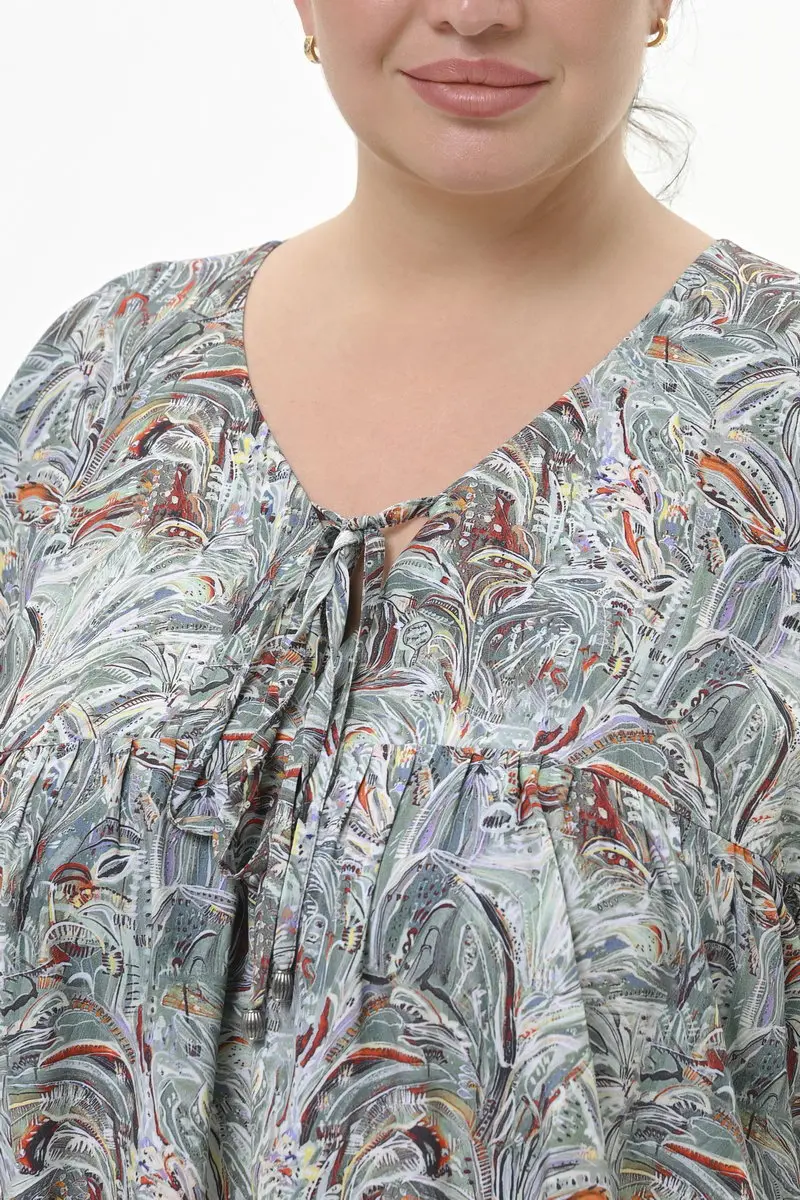 Свободная туника из принтованного штапеля с цельнокроенным рукавом. Верхняя часть на кокетке. Нижняя часть со сборкой по шву притачивания кокетки. Вырез горловины фигурный, завязывающийся на шнурочек из основной ткани.
