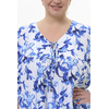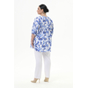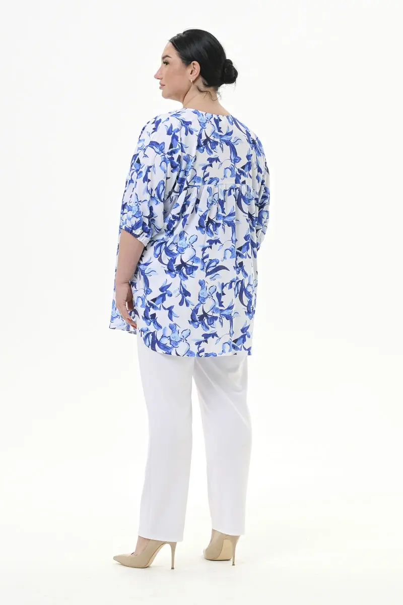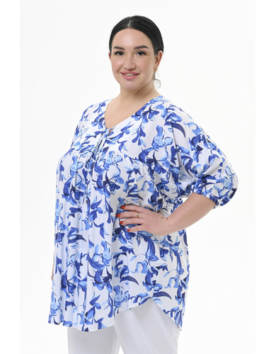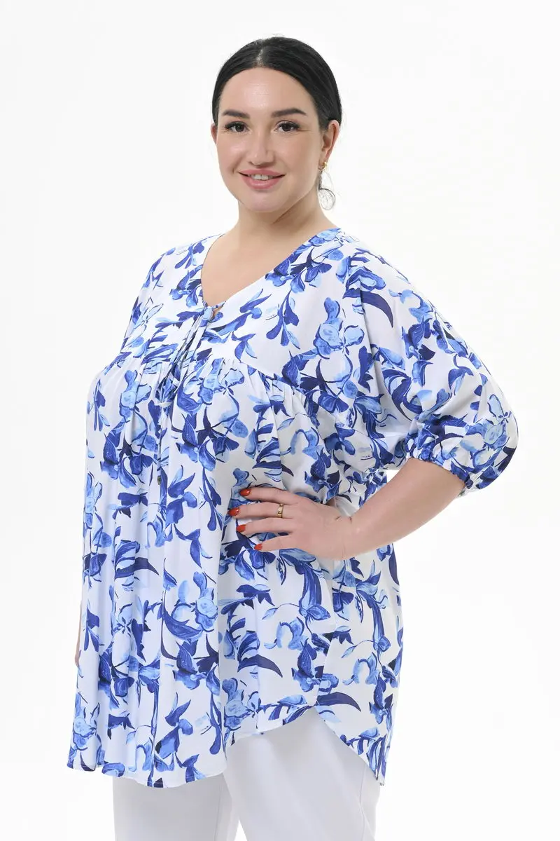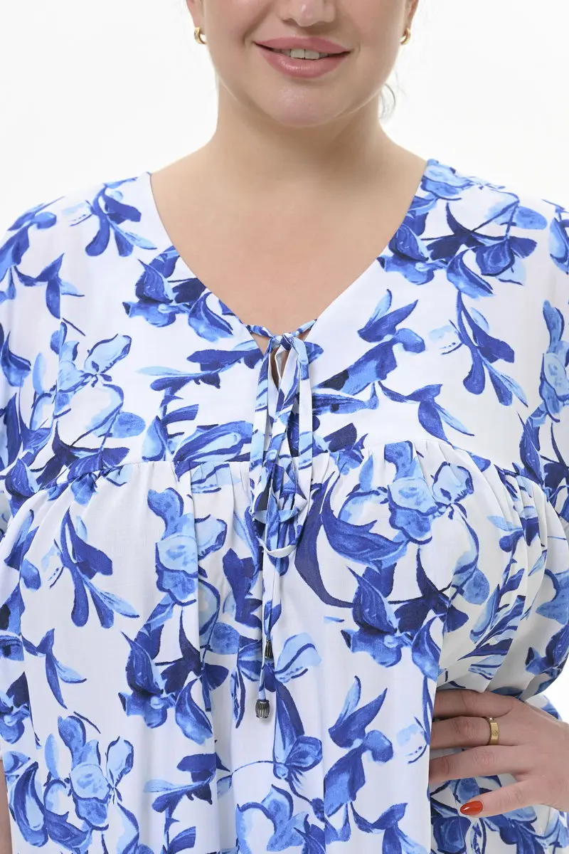 Свободная туника из принтованного штапеля с цельнокроенным рукавом. Верхняя часть на кокетке. Нижняя часть со сборкой по шву притачивания кокетки. Вырез горловины фигурный, завязывающийся на шнурочек из основной ткани.