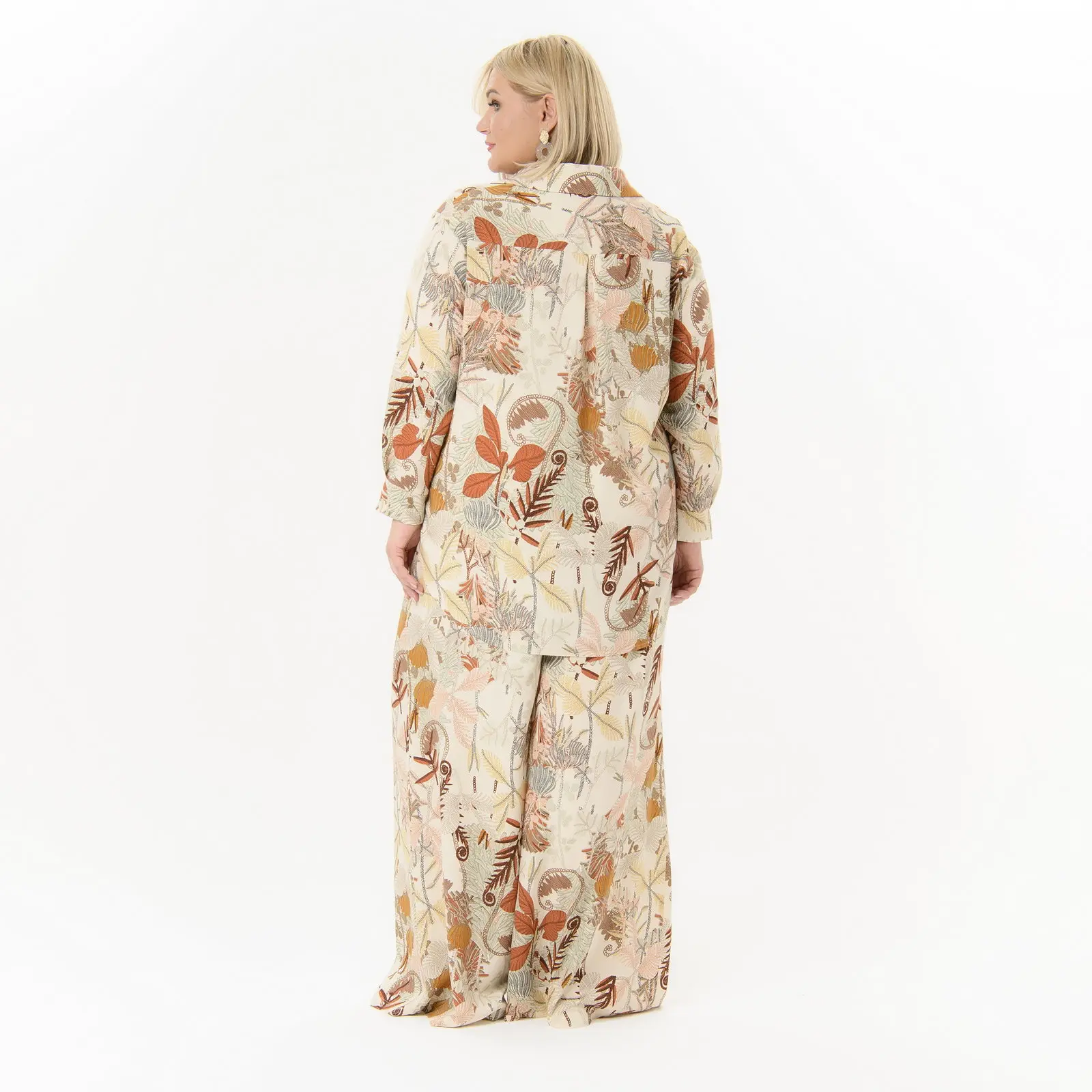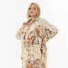 Свободная туника из штапеля. Линия плеча спущена, низ рукава присборен, заканчивается манжетом. По переду V-вырез, переходящий в складку.