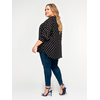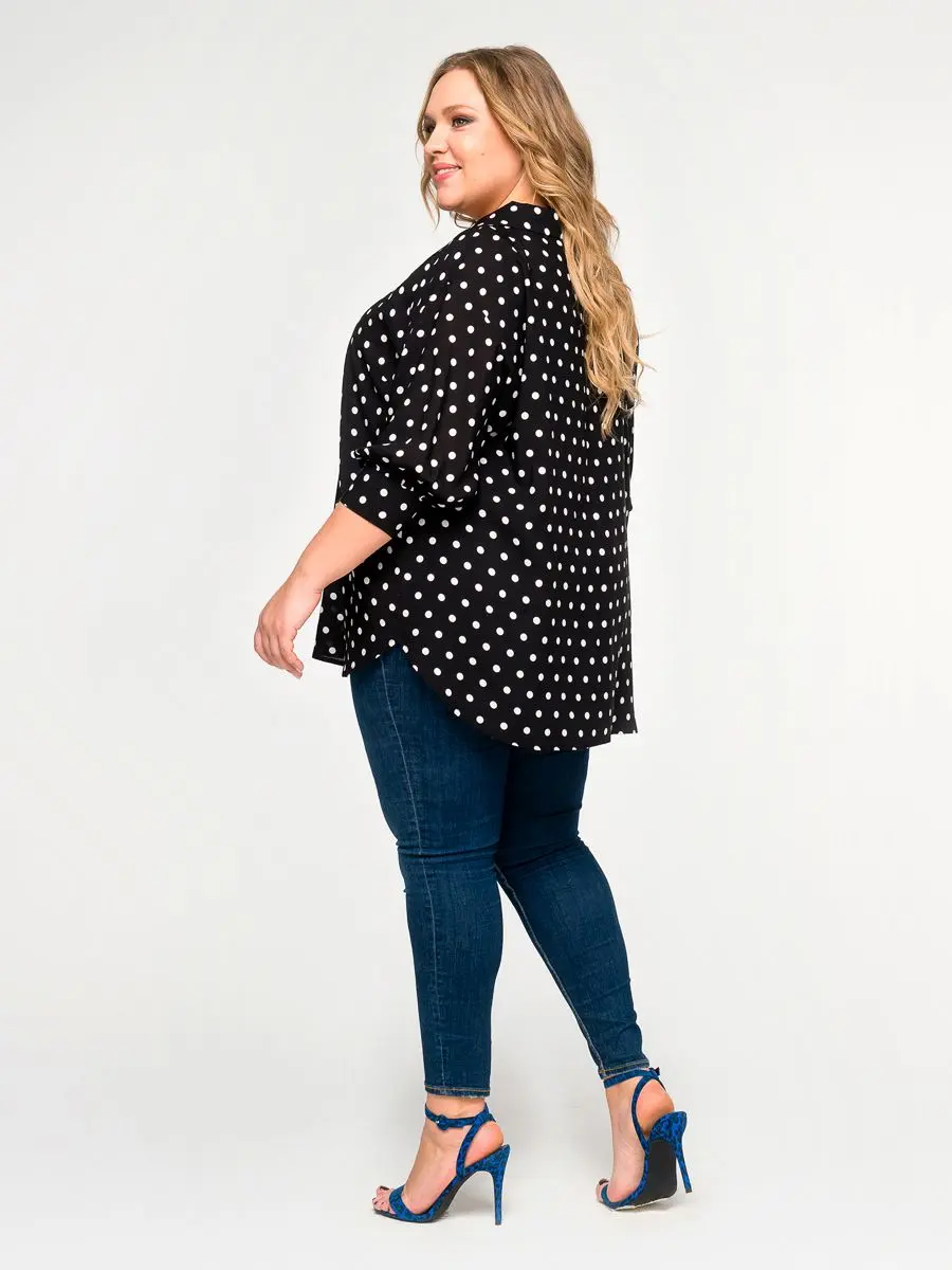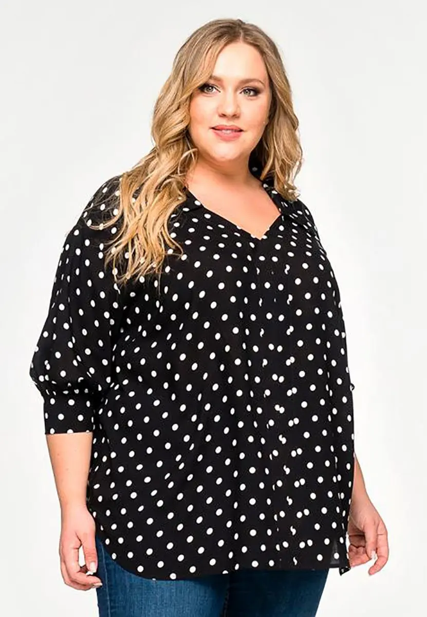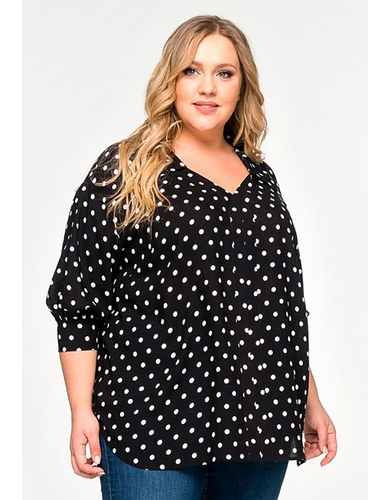 Свободная туника из штапеля. Линия плеча спущена, низ рукава присборен, заканчивается манжетом. По центру переда планка, плавно переходящая в вырез, в который втачан рубашечный воротник.