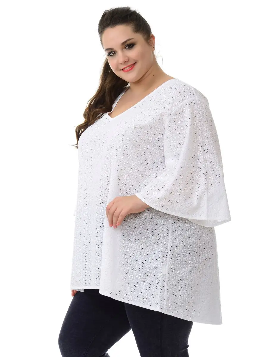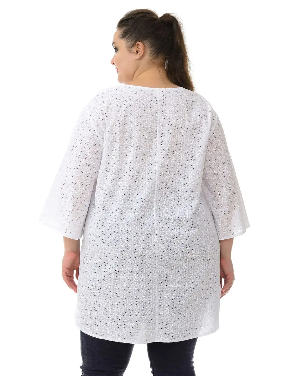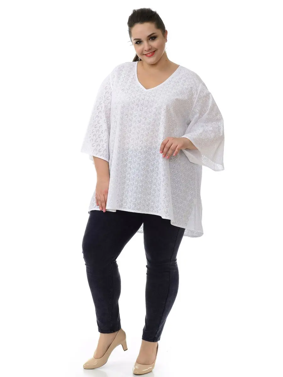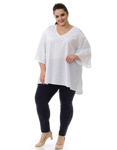 Свободная туника с асимметричной линией низа из хлопка. V-вырез горловины. Рукав расклешенный. Идеально сочетается с джинсами, зауженными брючками.