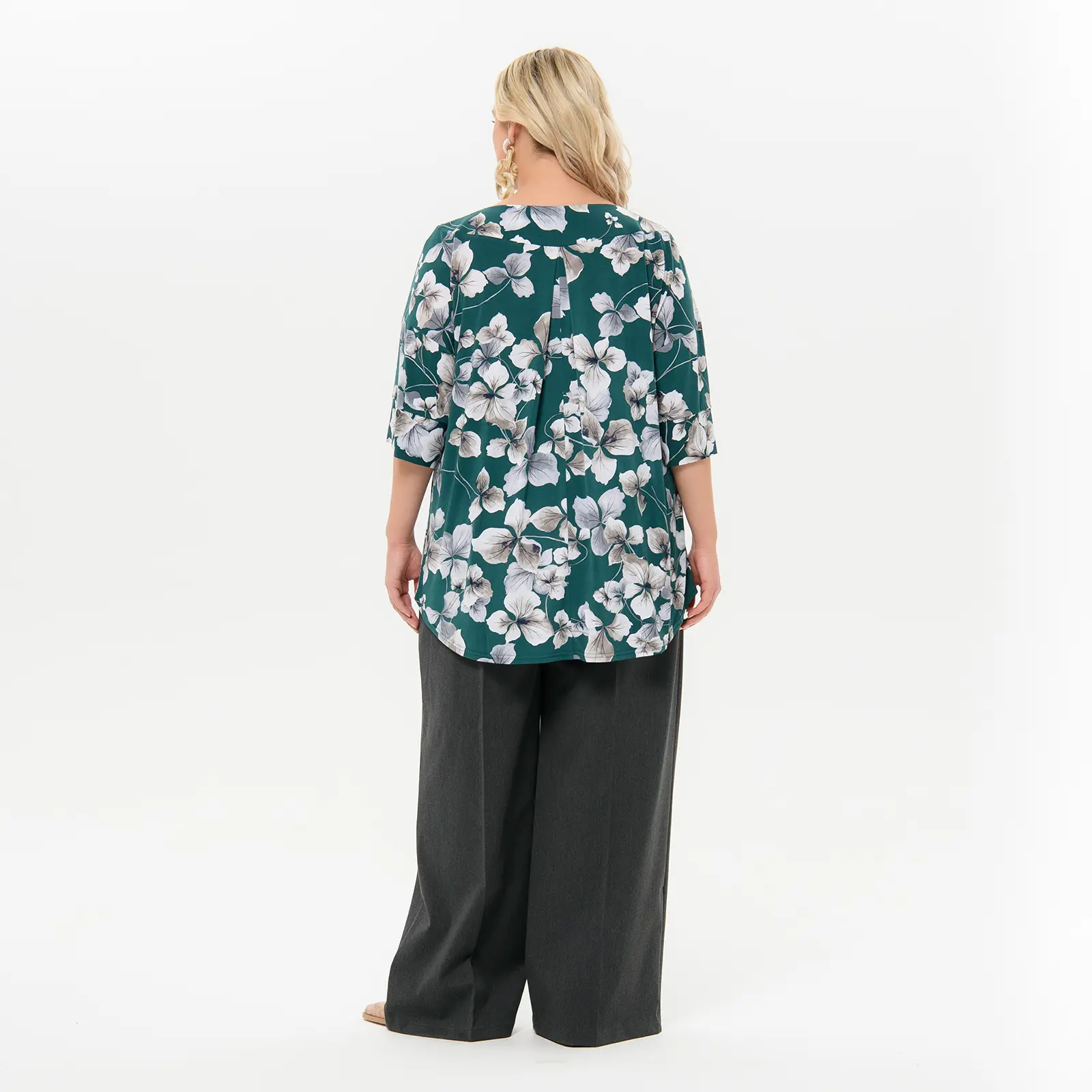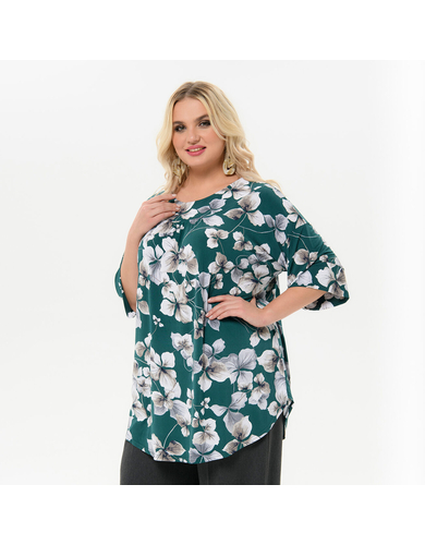 > Туника свободная, изумрудная с цветочным принтом