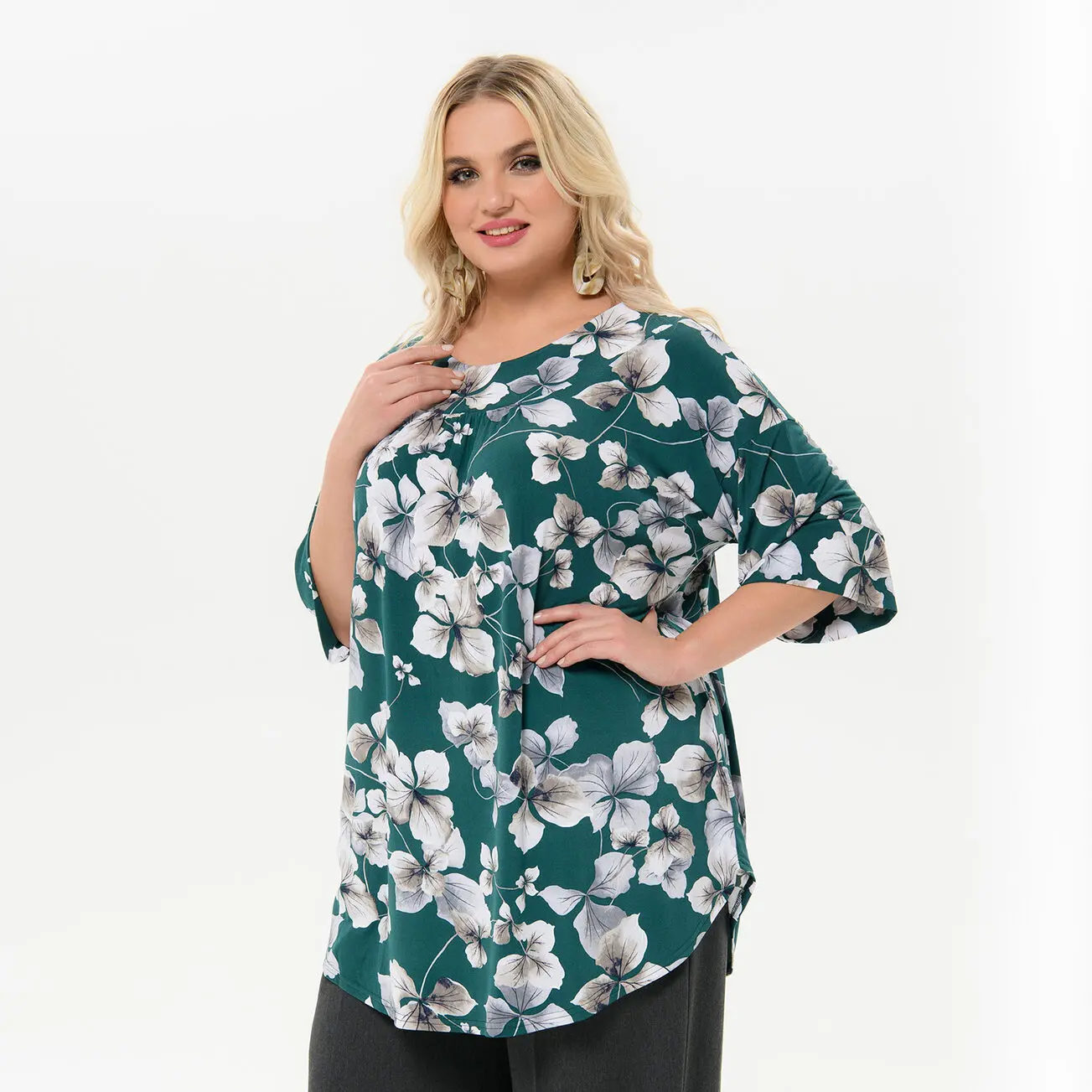 Туника свободная, изумрудная с цветочным принтом