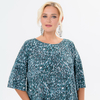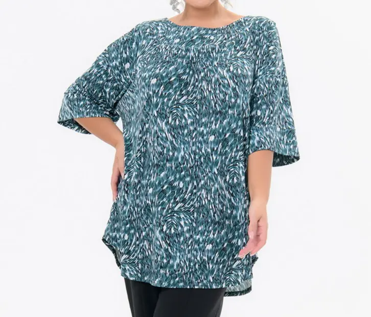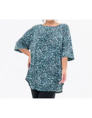 Свободная туника из принтованого трикотажа "масло". Горловина на широкой закругленной обтачке. По центру переда из под кокетки сборочка, по центру спинки встречная складка. Линия плеча спущена, рукав прямой, свободный, с широким манжетом.