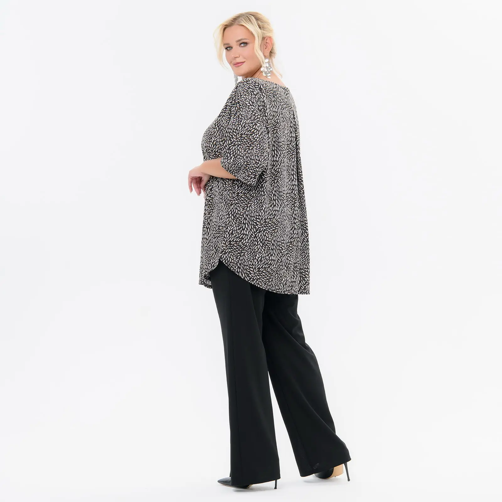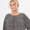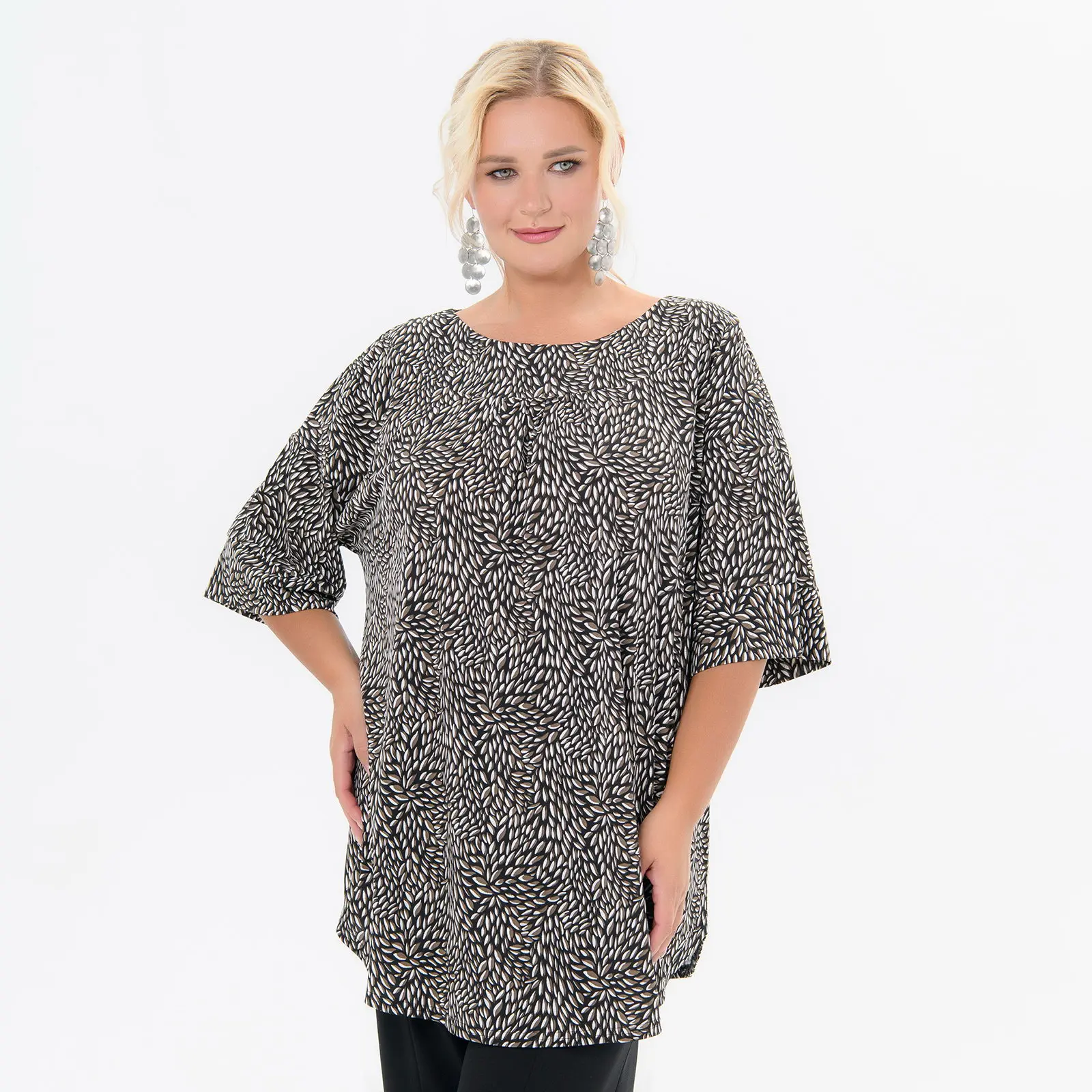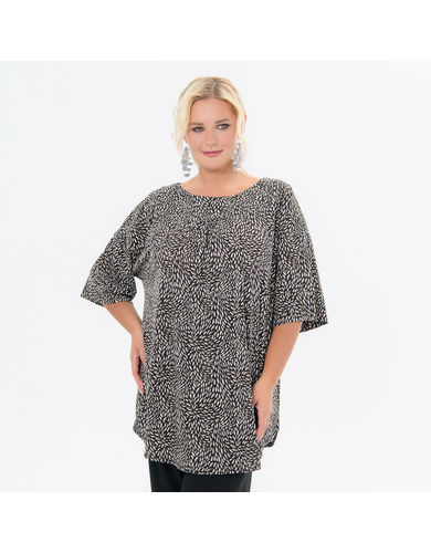 Свободная туника из принтованного трикотажа "масло". Горловина на широкой закругленной обтачке. По центру переда из под кокетки сборочка, по центру спинки встречная складка. Линия плеча спущена, рукав прямой, свободный, с широким манжетом.