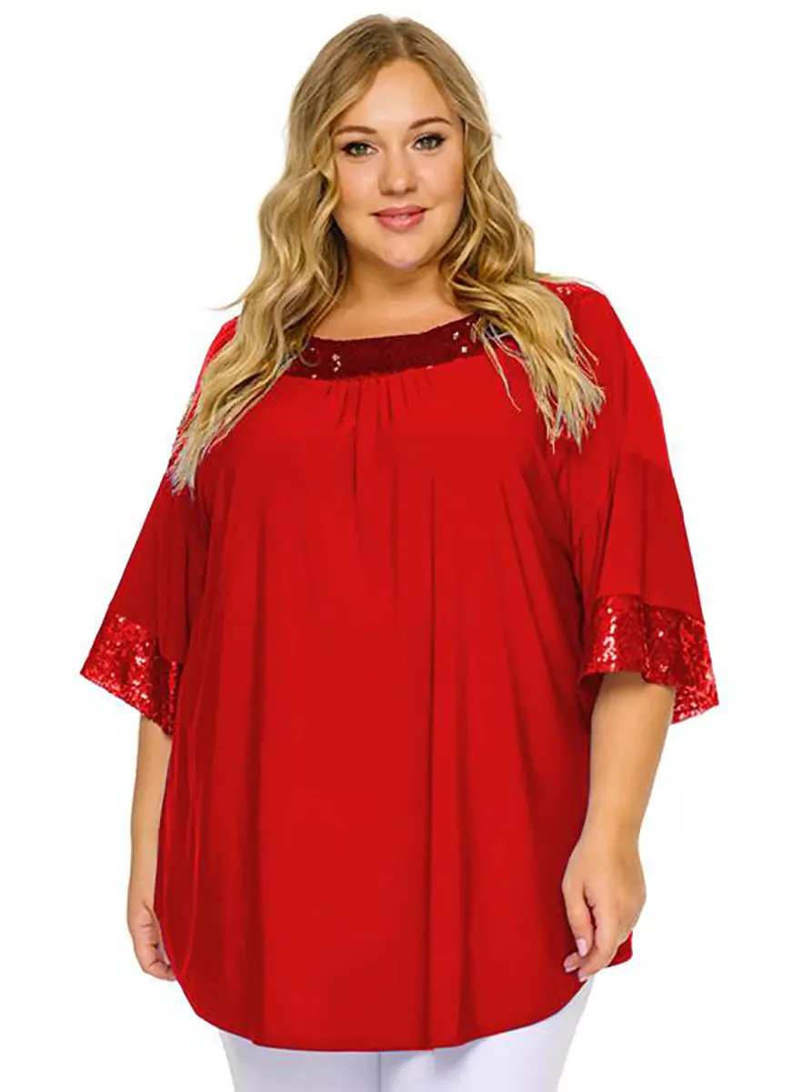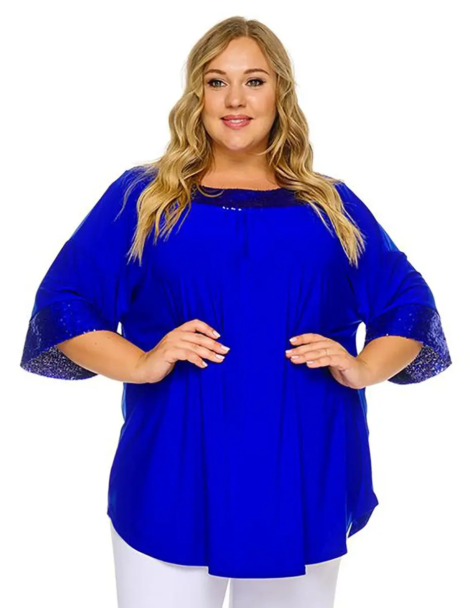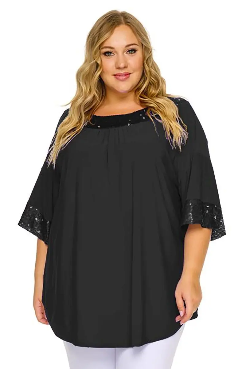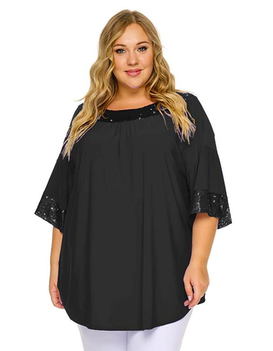Стильная туника из трикотажа свободного силуэта. Горловина на закругленной кокетке, отделана пайетками. По центру спинки из-под кокетки - встречная складка. Линия плеча спущенна, рукав расширенный, заканчивающийся свободным манжетом из пайеток.