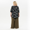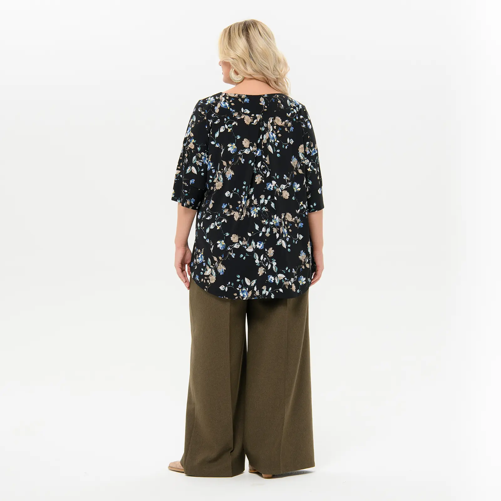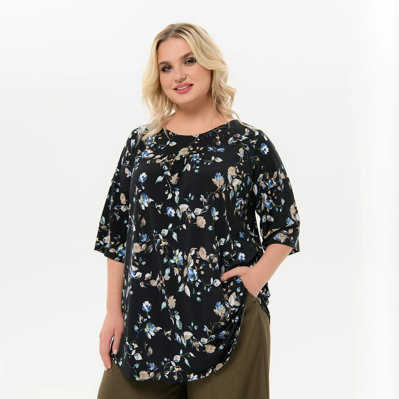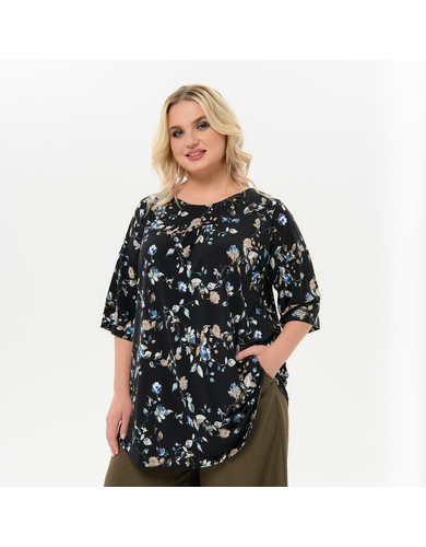 Свободная туника из принтованного трикотажа "масло". Горловина на широкой закругленной обтачке. По центру переда из под кокетки сборочка, по центру спинки встречная складка. Линия плеча спущена, рукав прямой, свободный, с широким манжетом.