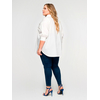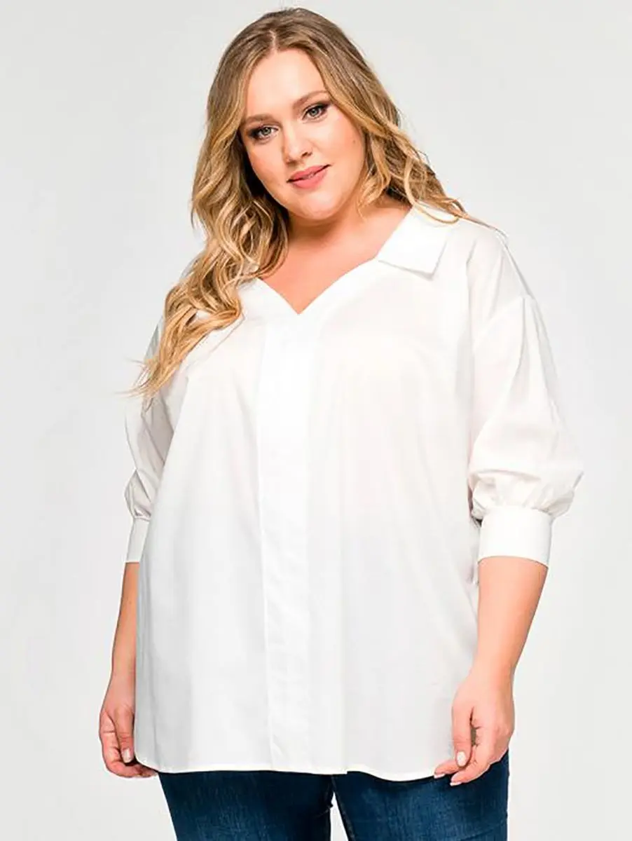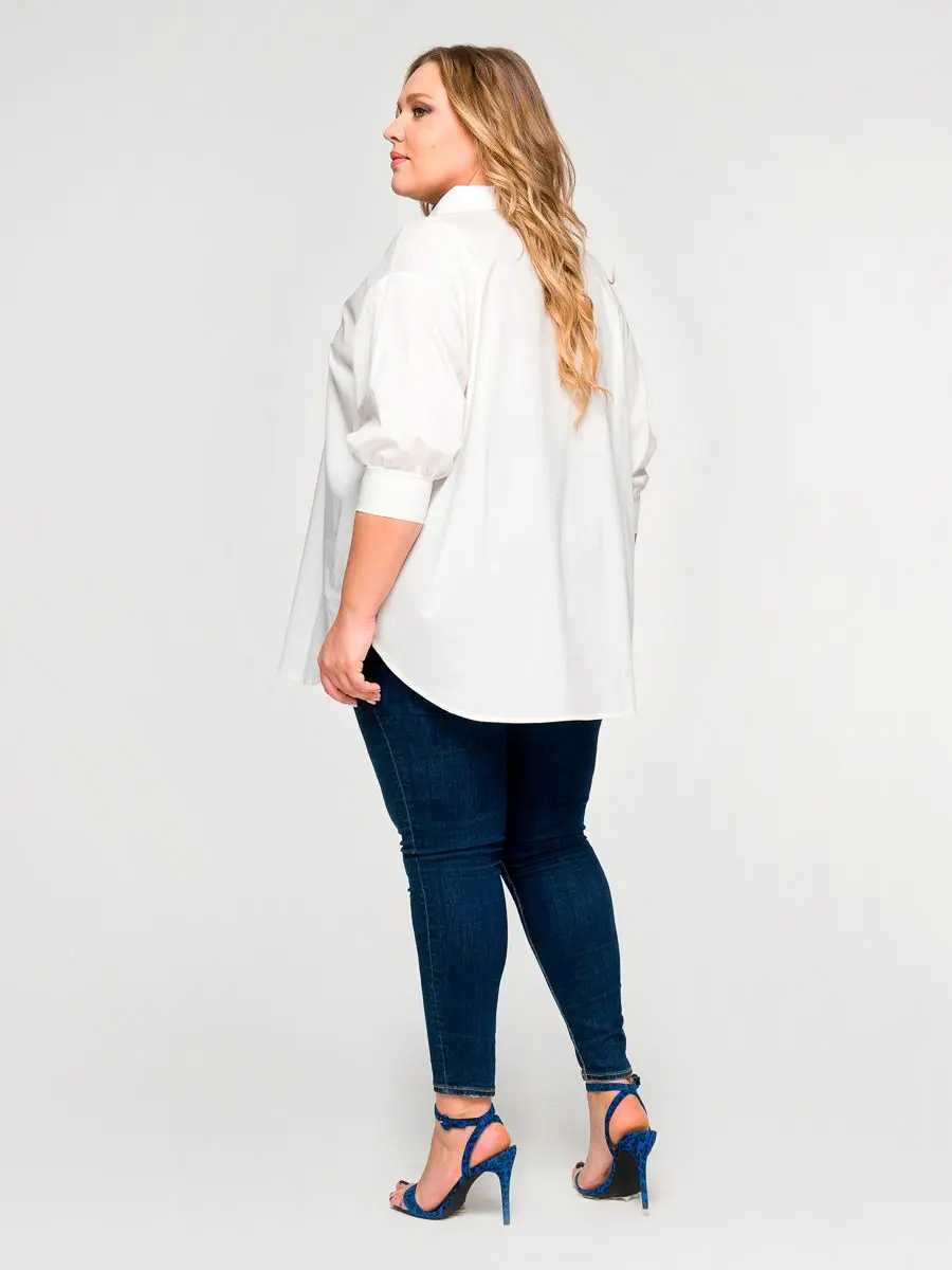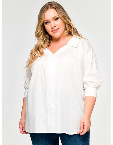 Свободная туника из штапеля. Линия плеча спущена, низ рукава присборен, заканчивается манжетом. По центру переда планка, плавно переходящая в вырез, в который втачан рубашечный воротник.