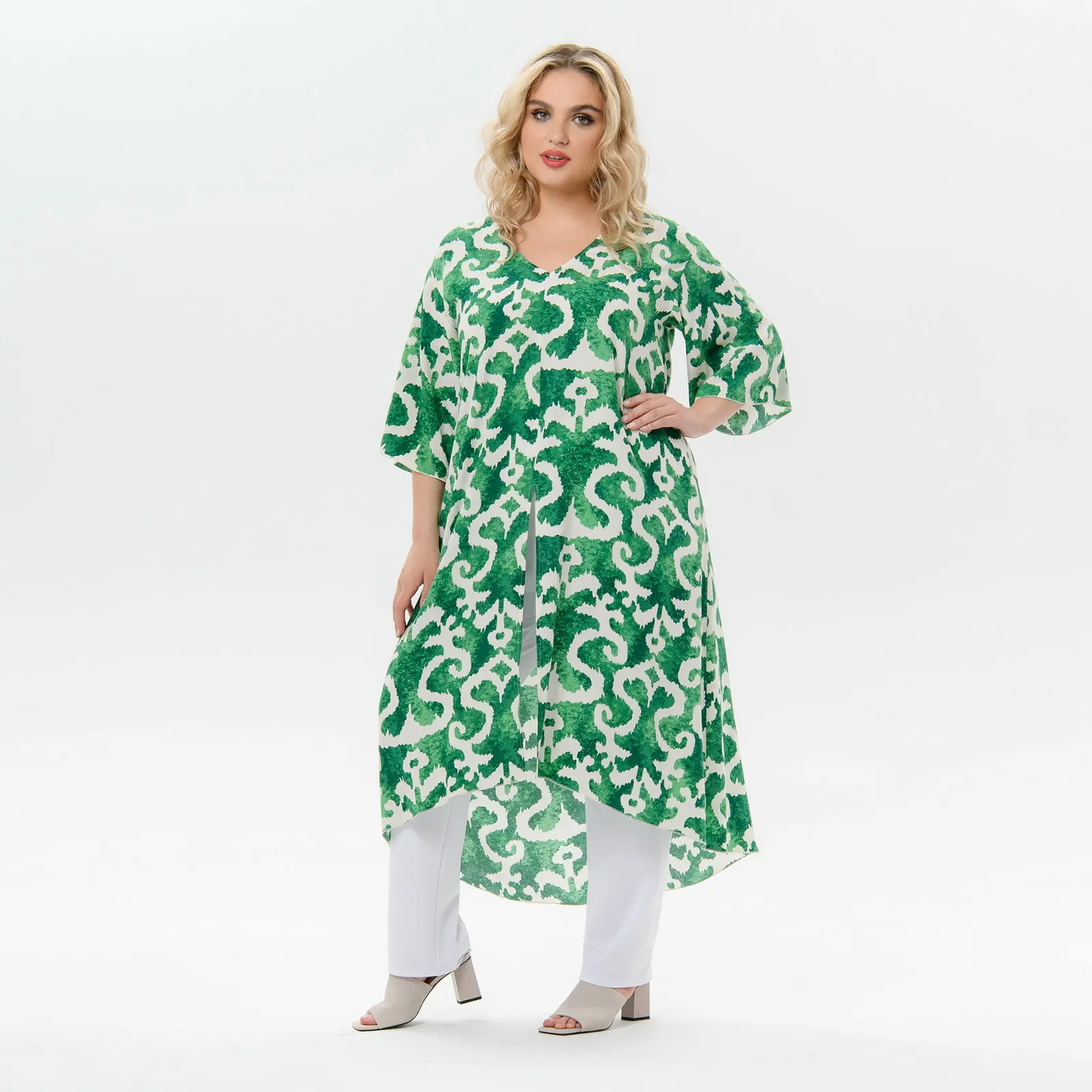 Легкая удлиненная туника с разрезом спереди и широкими рукавами из штапеля. Прекрасно подойдет к летнему образу, составив отличный комплект с джинсами или брюками. Также можно применять как пляжную тунику.