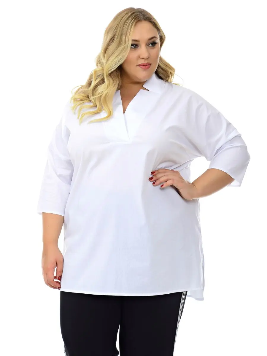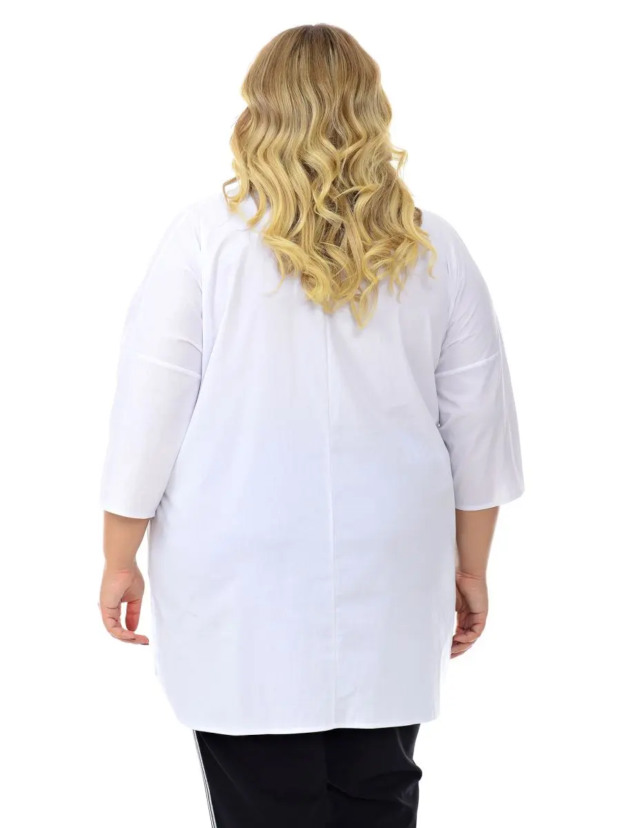 Туника в стиле "кимоно"I из полотна, содержащего хлопок. Модель свободного силуэта. Плосколежащий воротник выполнен в виде широкой планки, наложенной друг на друга и втачной в V-образную. горловину, тем самым напоминая кимоно. Боковые швы задней части закруглены в области низа. Перед короче спинки на 6 см. Очень удобный свободный рукав, выполнен на основе спущенного.