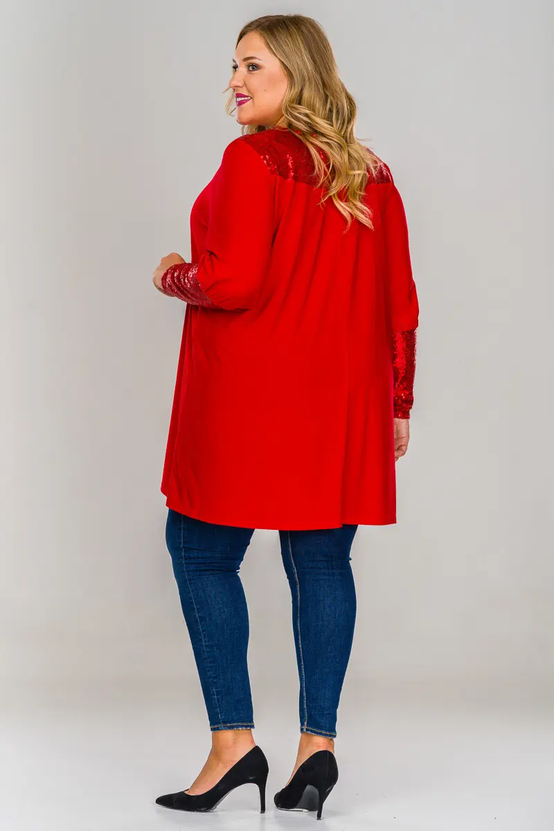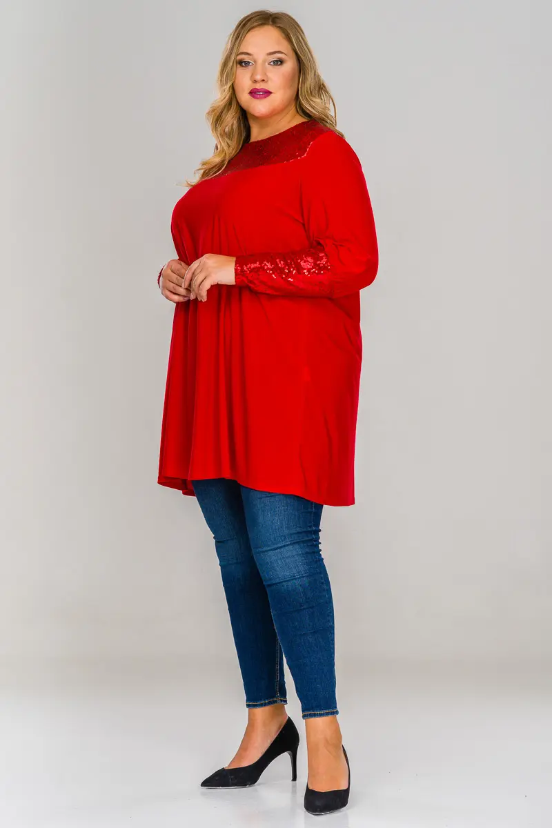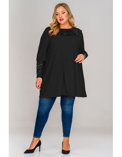 Нарядная туника свободного силуэта, кокетка и манжеты выполены из пайеток в цвет основной ткани.