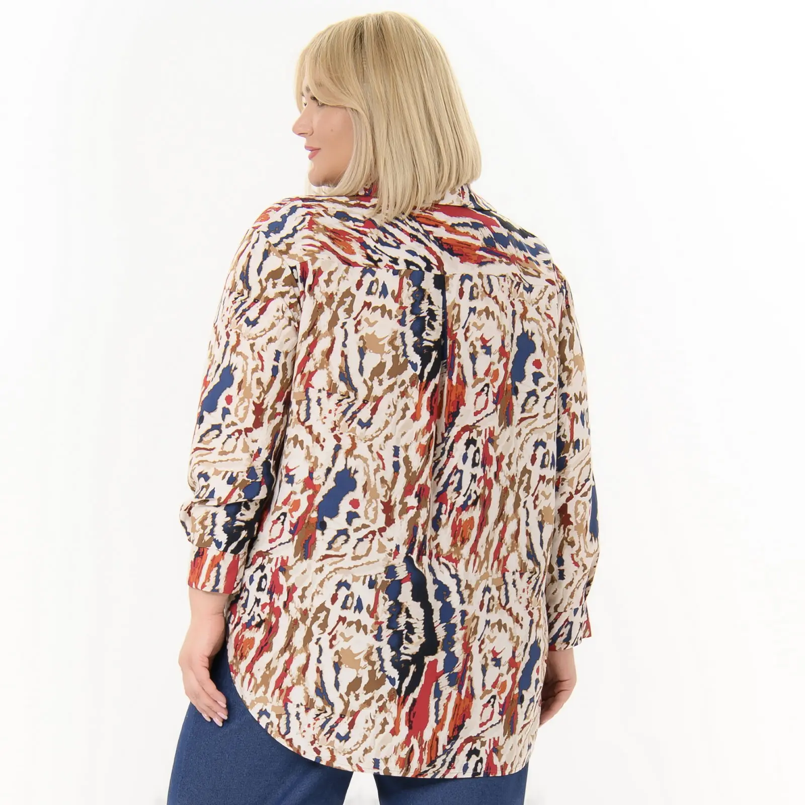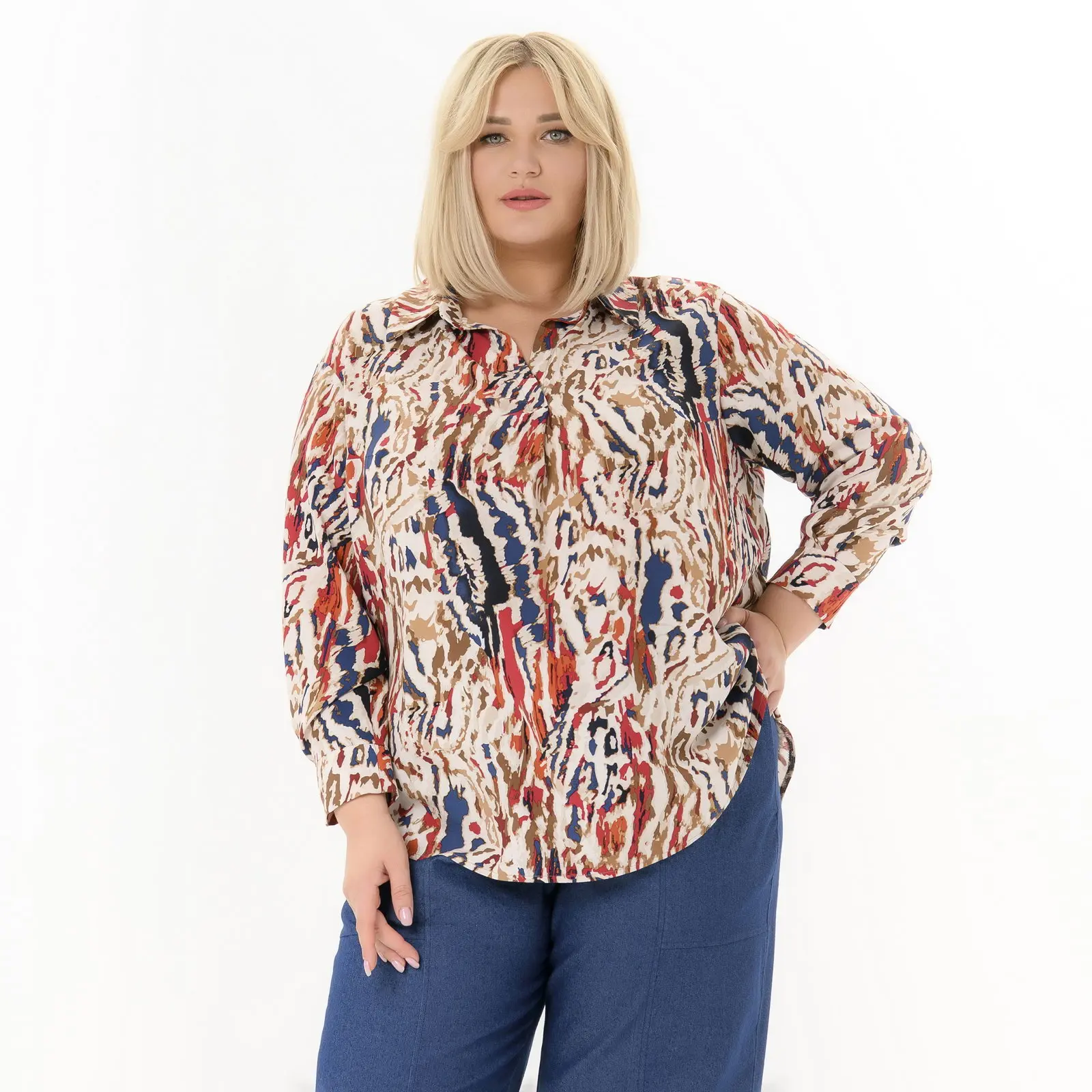 Свободная туника из штапеля. Линия плеча спущена, низ рукава присборен, заканчивается манжетом. По переду V-вырез, переходящий в складку.