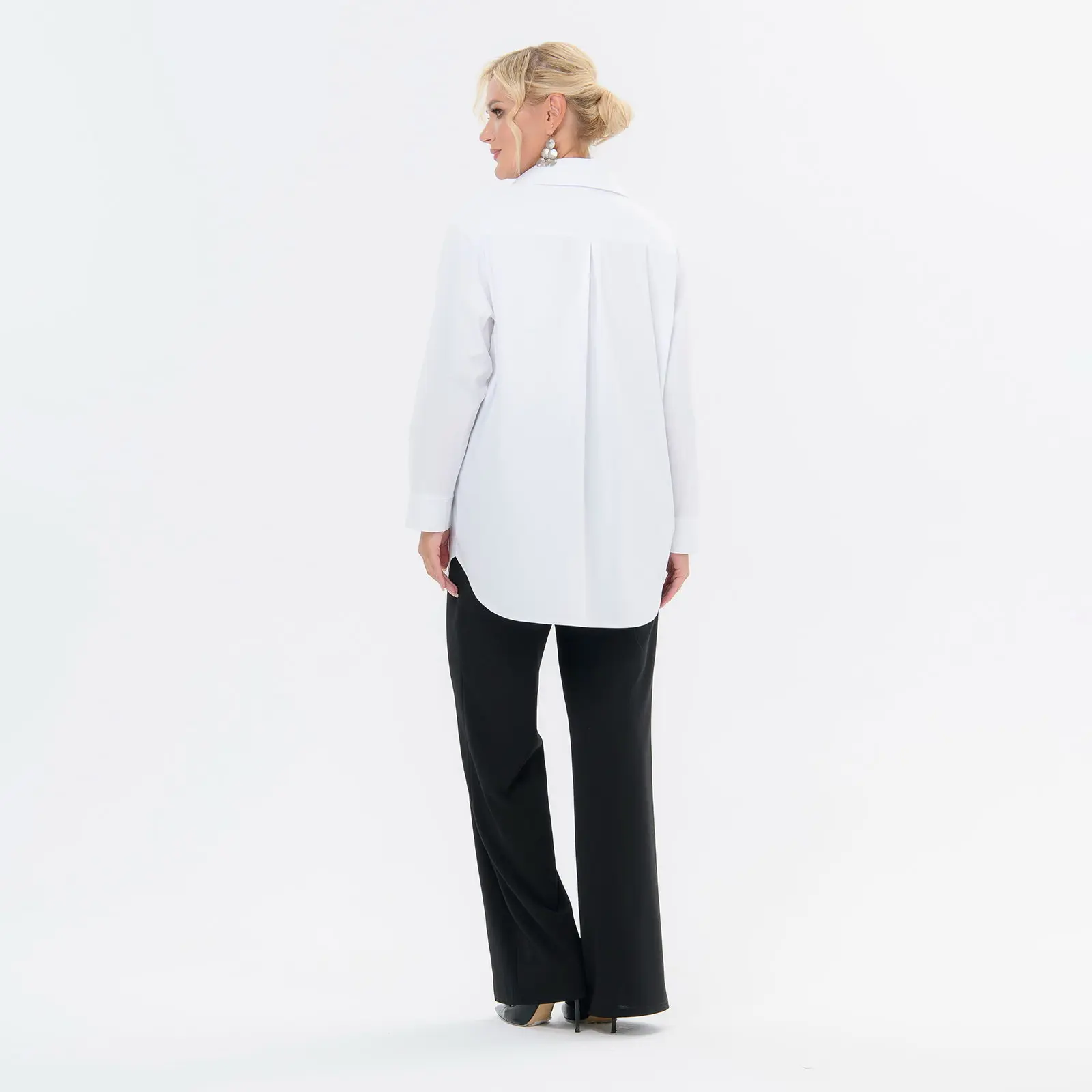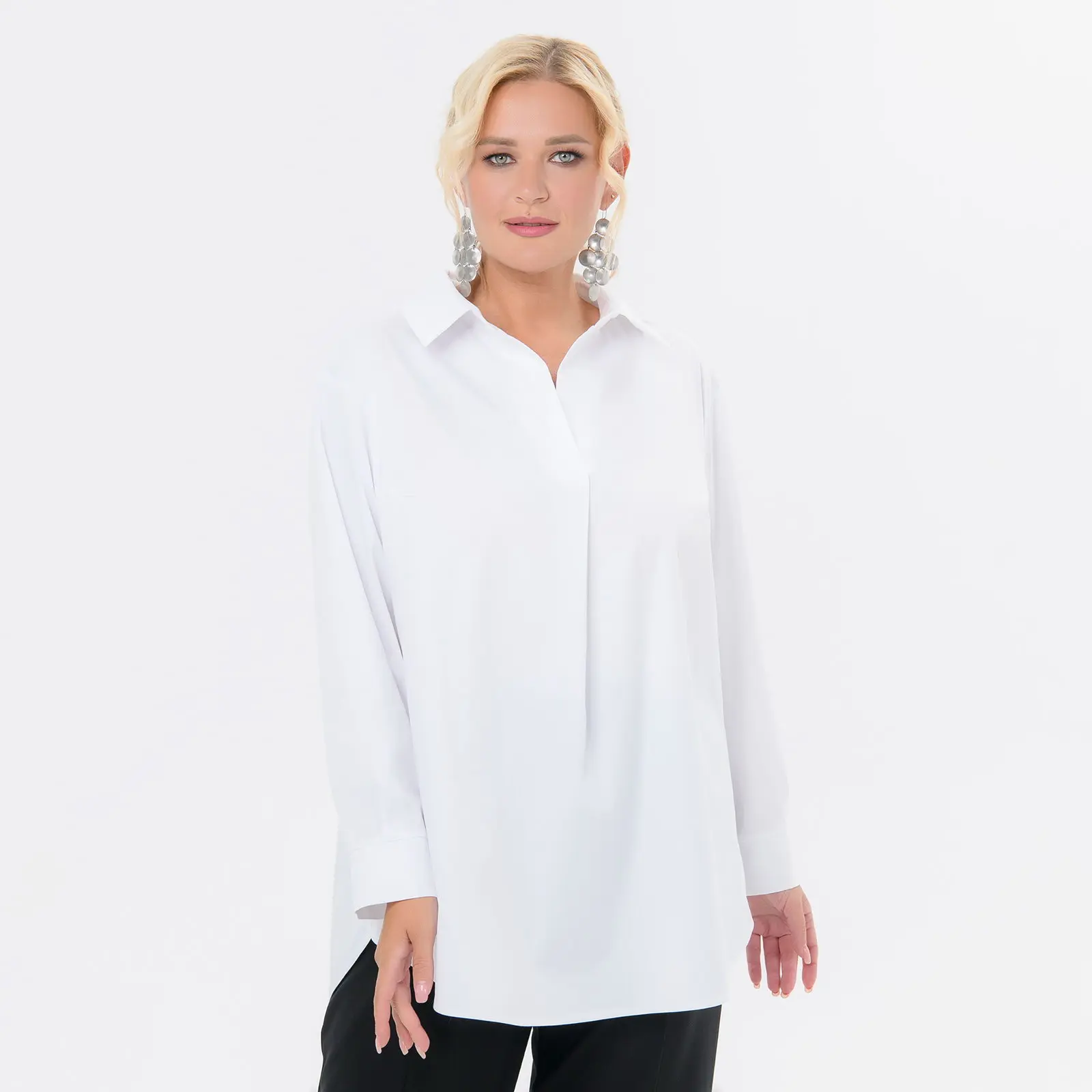 Свободная туника из хлопка. Линия плеча спущена, низ рукава присборен, заканчивается манжетом. По переду V-вырез, переходящий в складку.
