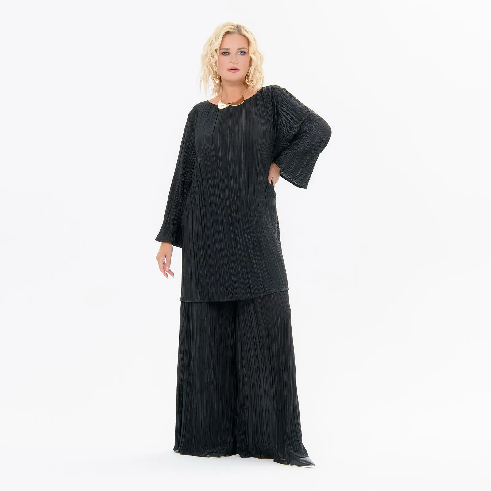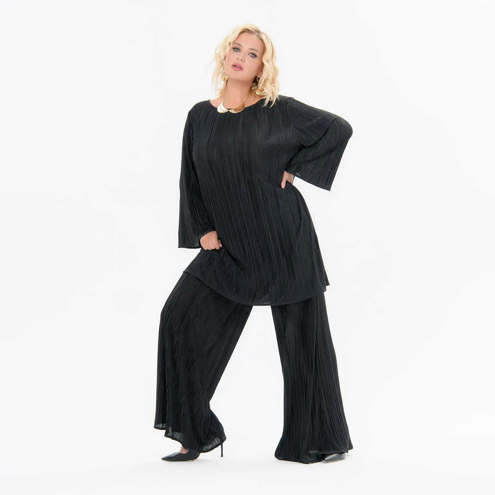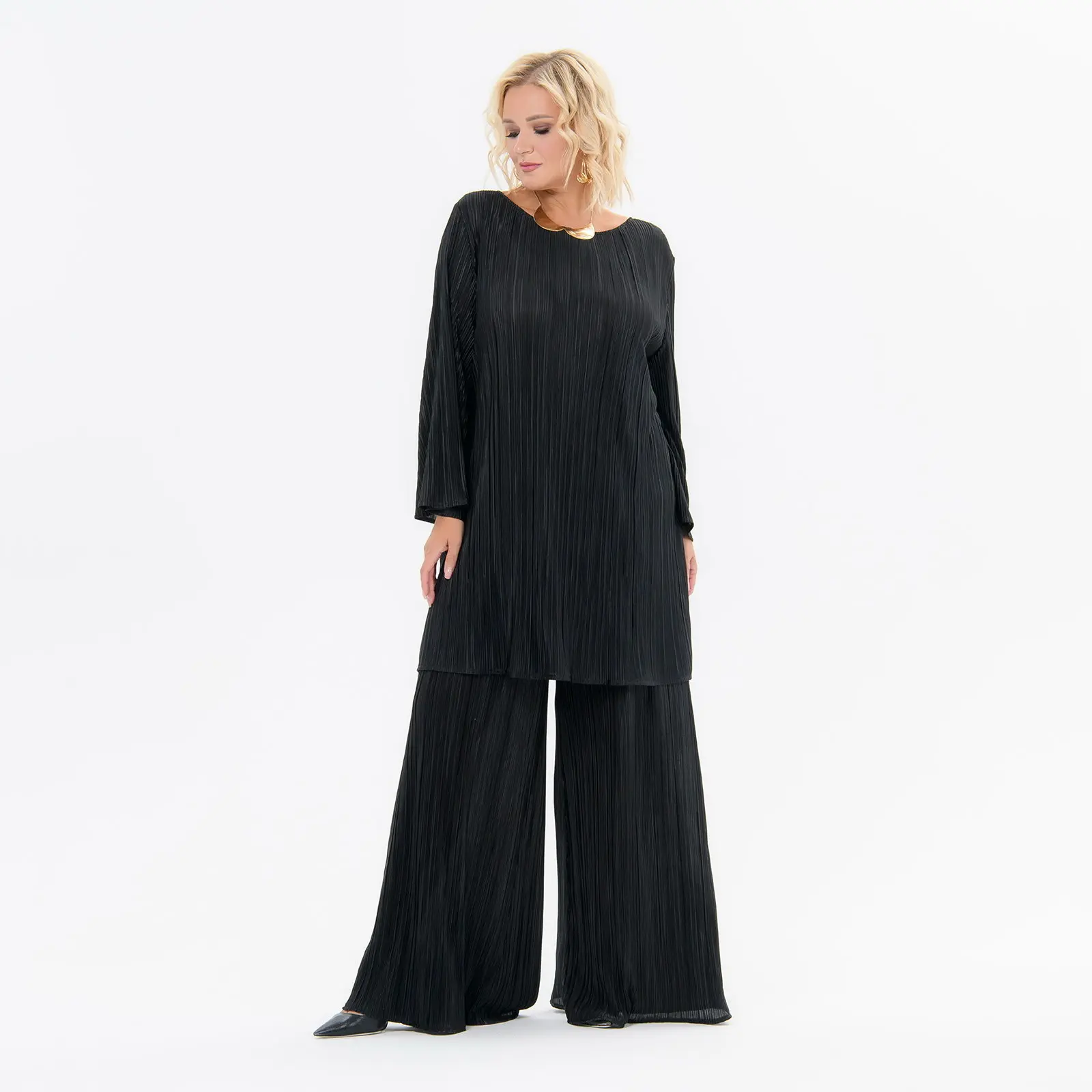 Брюки свободные, черные, из плиссированной ткани