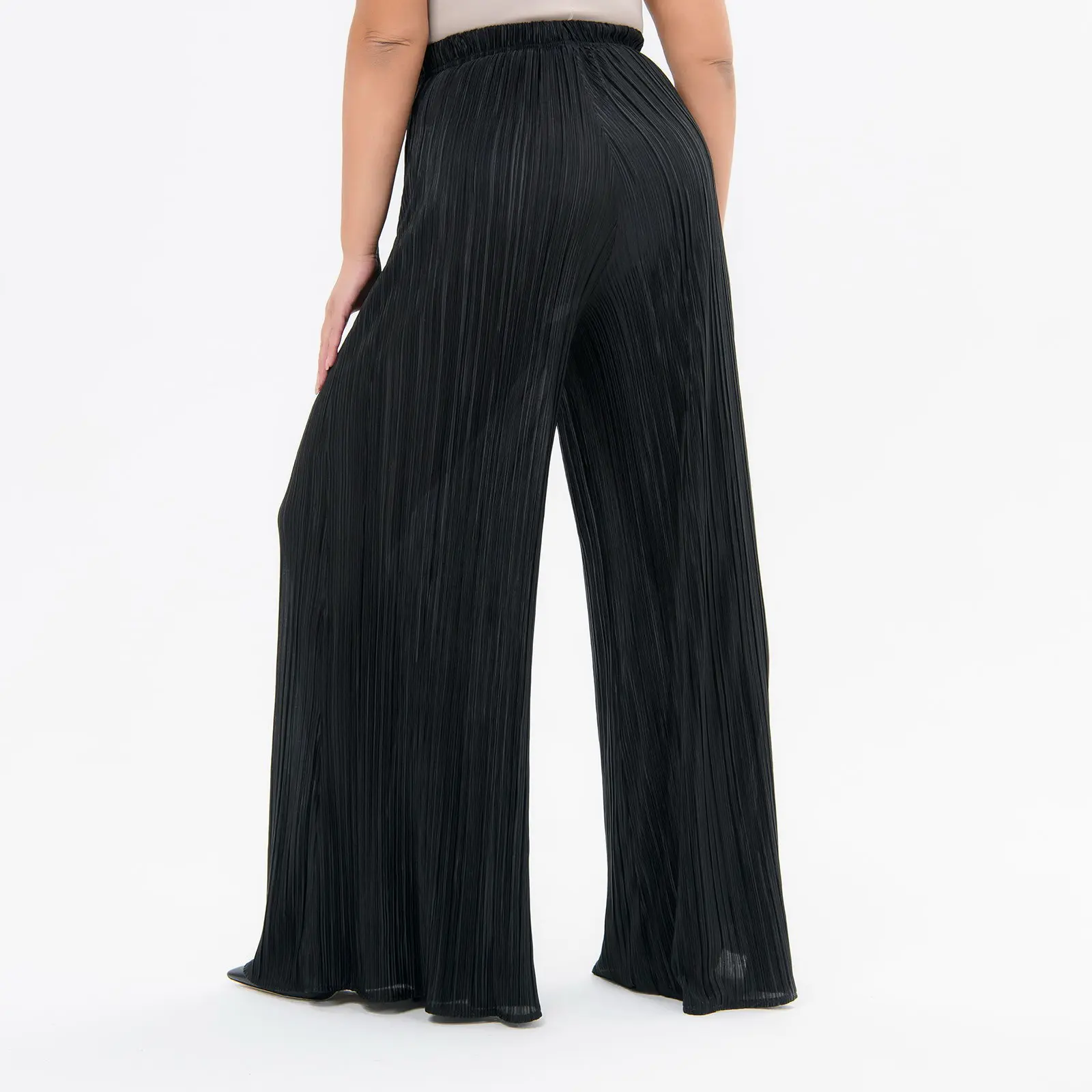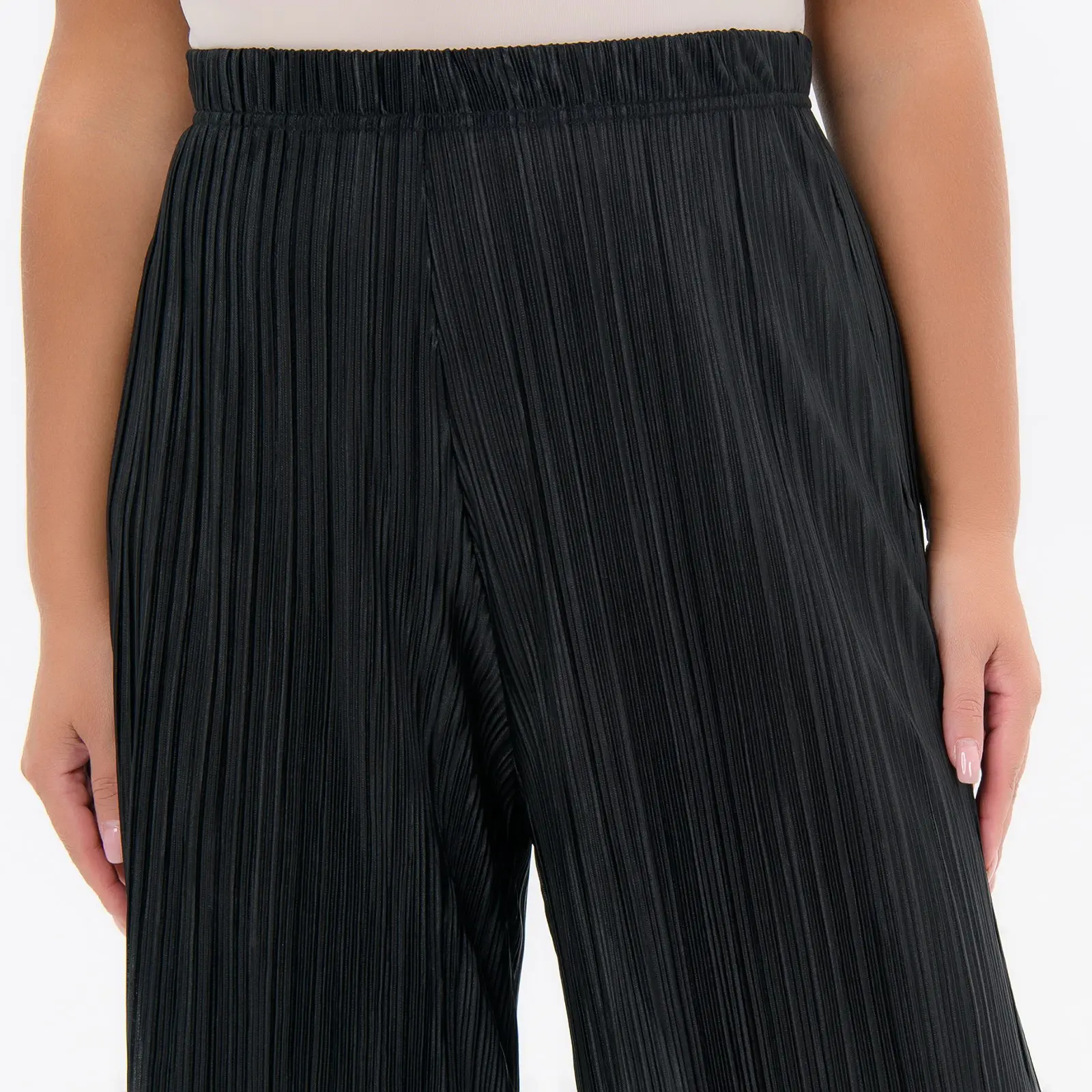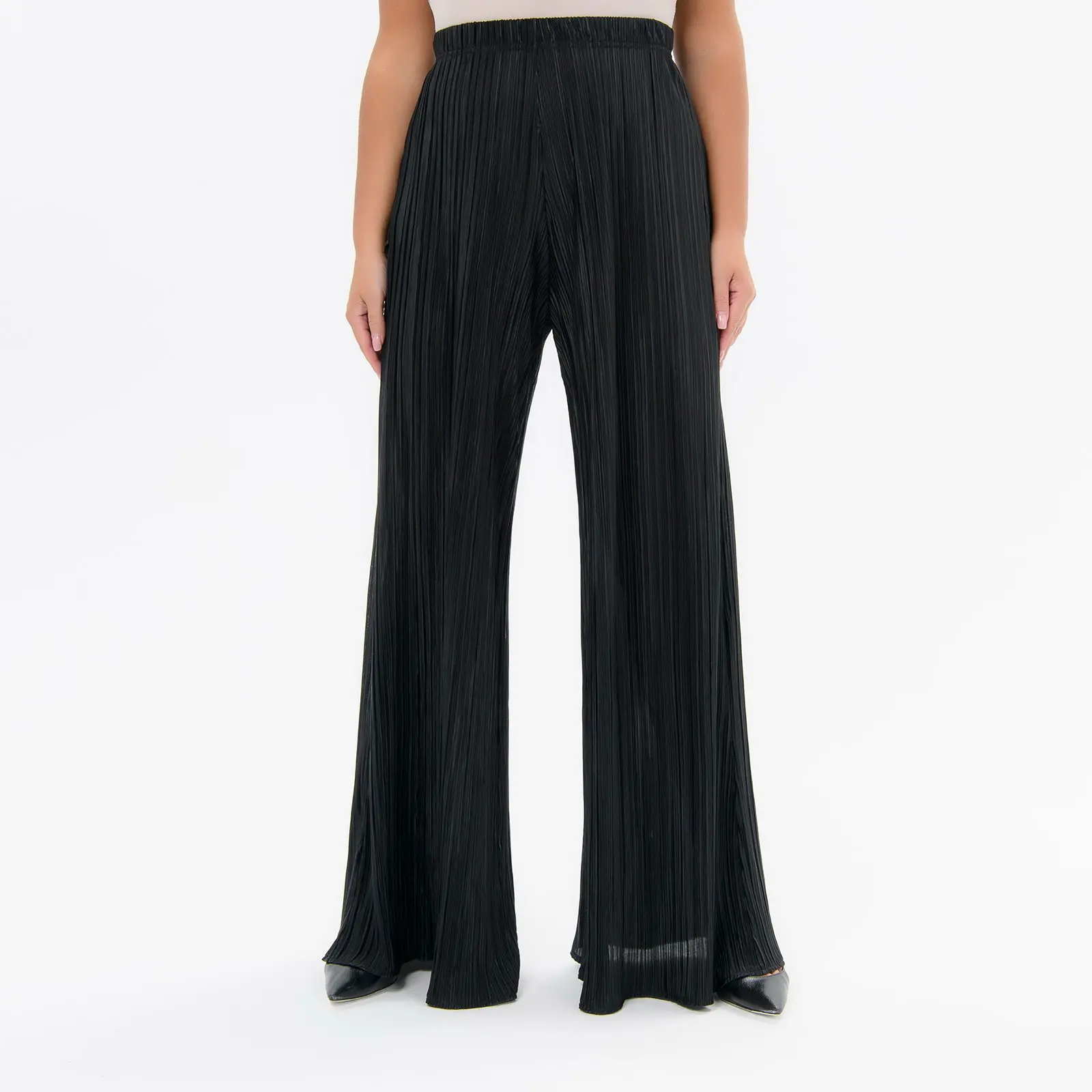 Расклешенные брюки из струящейся, плиссированной ткани. Верх на резинке шириной 3,5 см.