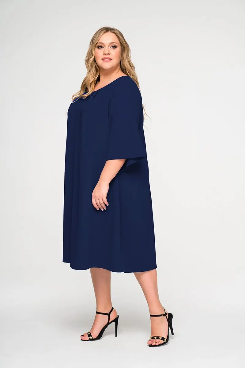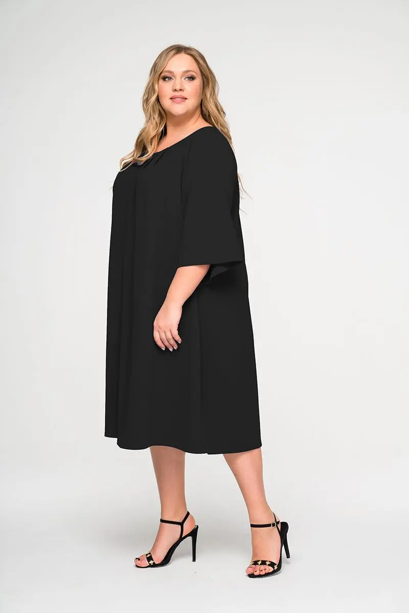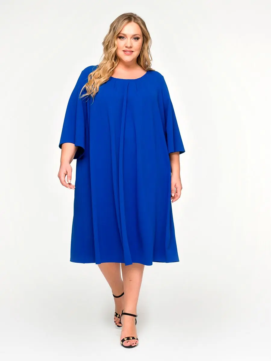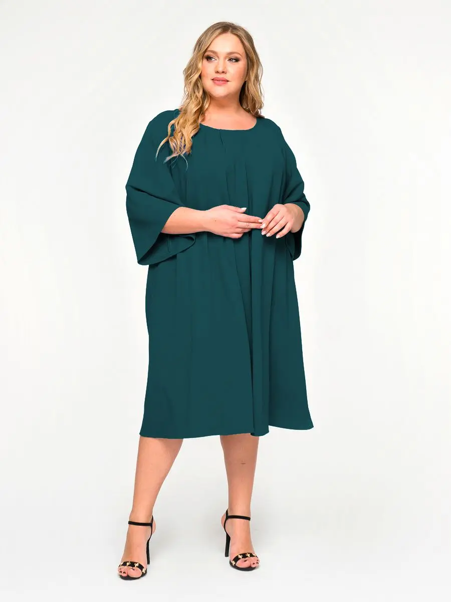 Платье из однотонного крепа трапецеевидного силуэта. По вырезу горловины заложены мягкие складки, вырез округлый. Рукав расклешенный.