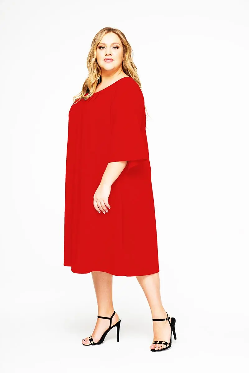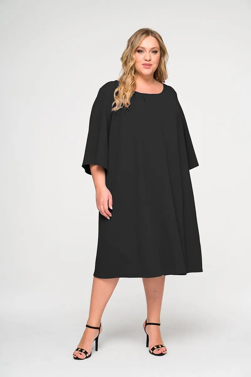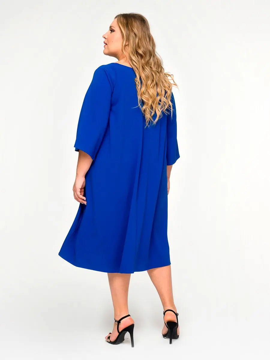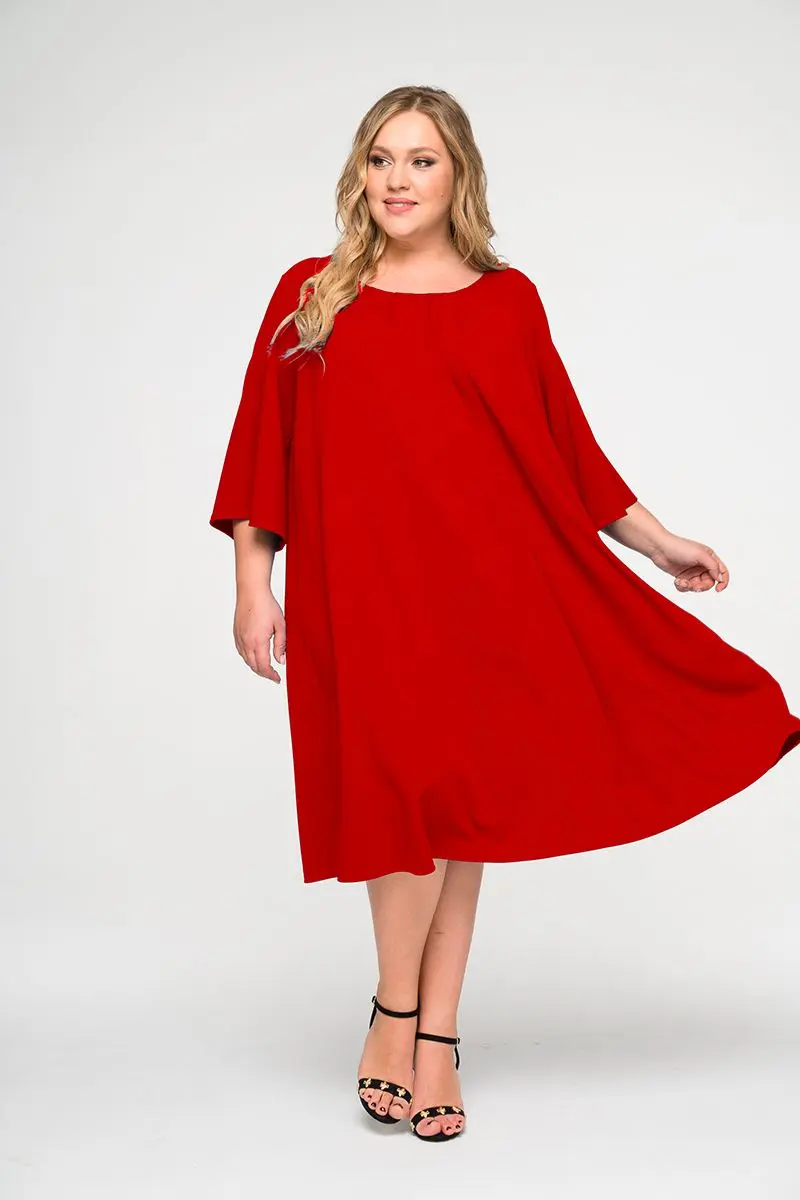 Платье из однотонного крепа трапецеевидного силуэта. По вырезу горловины заложены мягкие складки, вырез округлый. Рукав расклешенный.