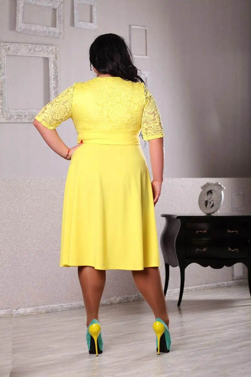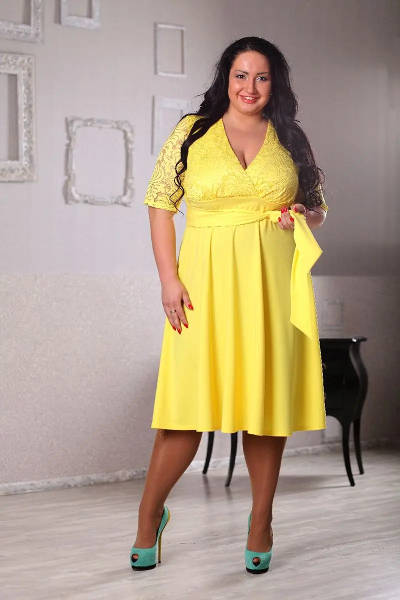 Платье из крепа с юбкой клеш, сшитое специально для дам с пышными формами, в наступающем сезоне будет более, чем актуальным, оно станет изюминкой каждого летнего гардероба, любимой вещью, с которой не захочется расставаться. Солнечный цвет этого наряда способен поднять настроение не только своей хозяйке, но и ее окружению. В летнюю жару это желтое платье большого размера подарит своей обладательнице столь желаемую прохладу, оно с легкостью перенесет стирки и не потребует глажки, длительное время не потеряет своей первоначальной привлекательности. В таком большом расклешенном платье можно отправиться на прогулку или в гости, полная дама везде будет ощущать себя в нем уютно и комфортно, оно будет уместно и в деловой обстановке, и на романтическом свидании.