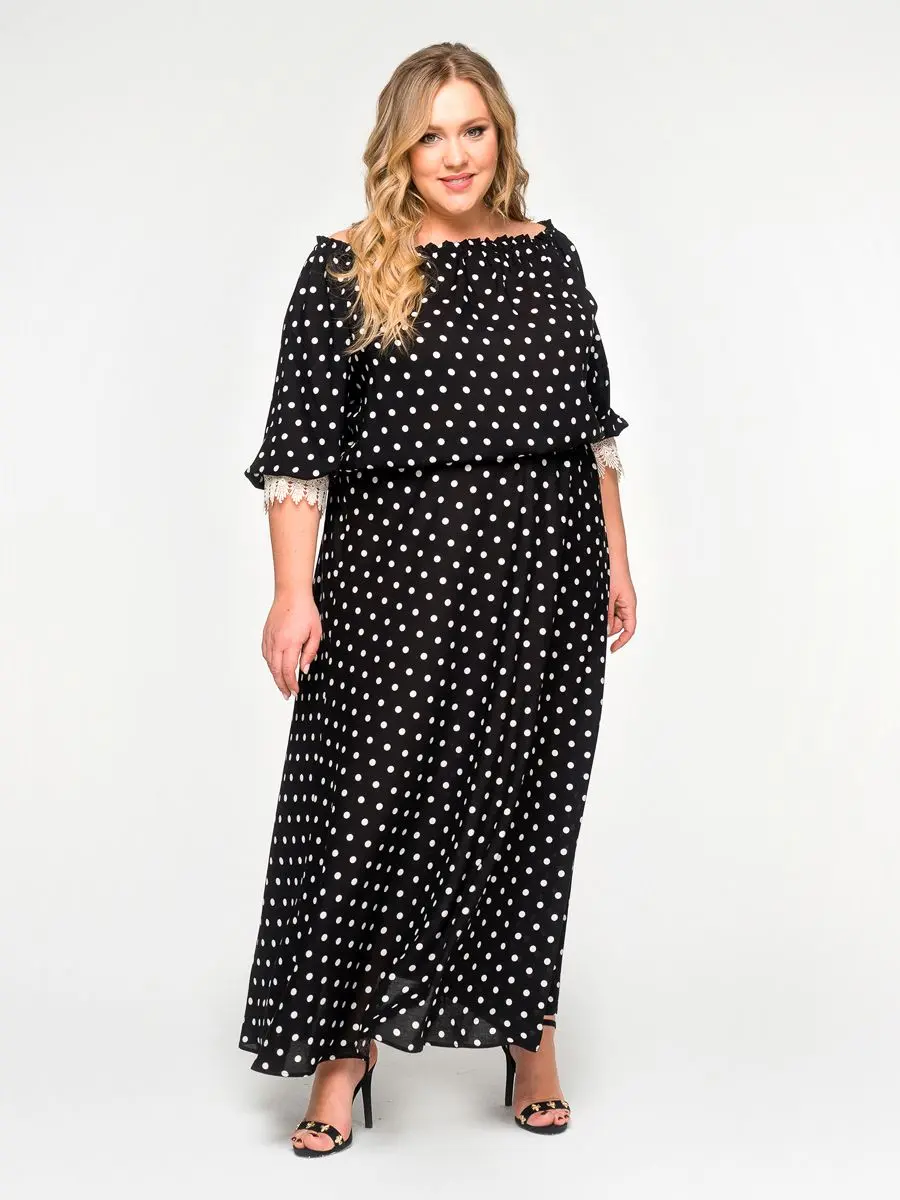Платье из штапеля свободного силуэта. Верхняя часть свободная, пот горловине резинка, позволяющая открывать плечи. Рукав на основе конструкции реглан, заканчивающийся манжетом из кружева. Нижняя часть расклешенная. По талии платья резинка.