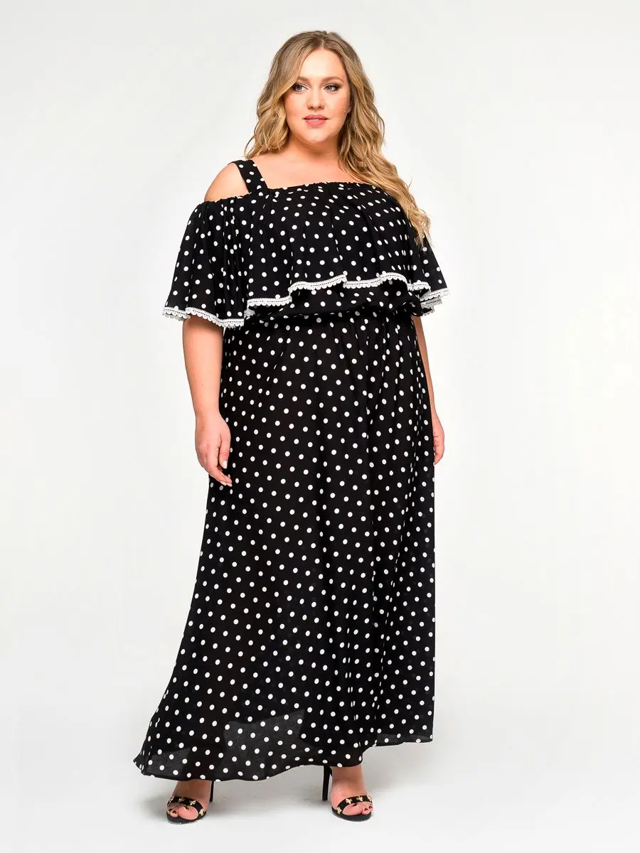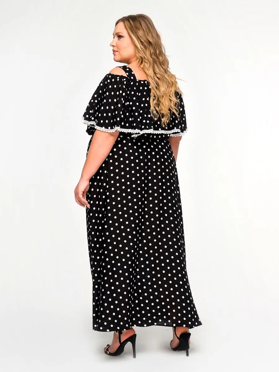 Платье из штапеля с воланом по горловине, принт "горошек"