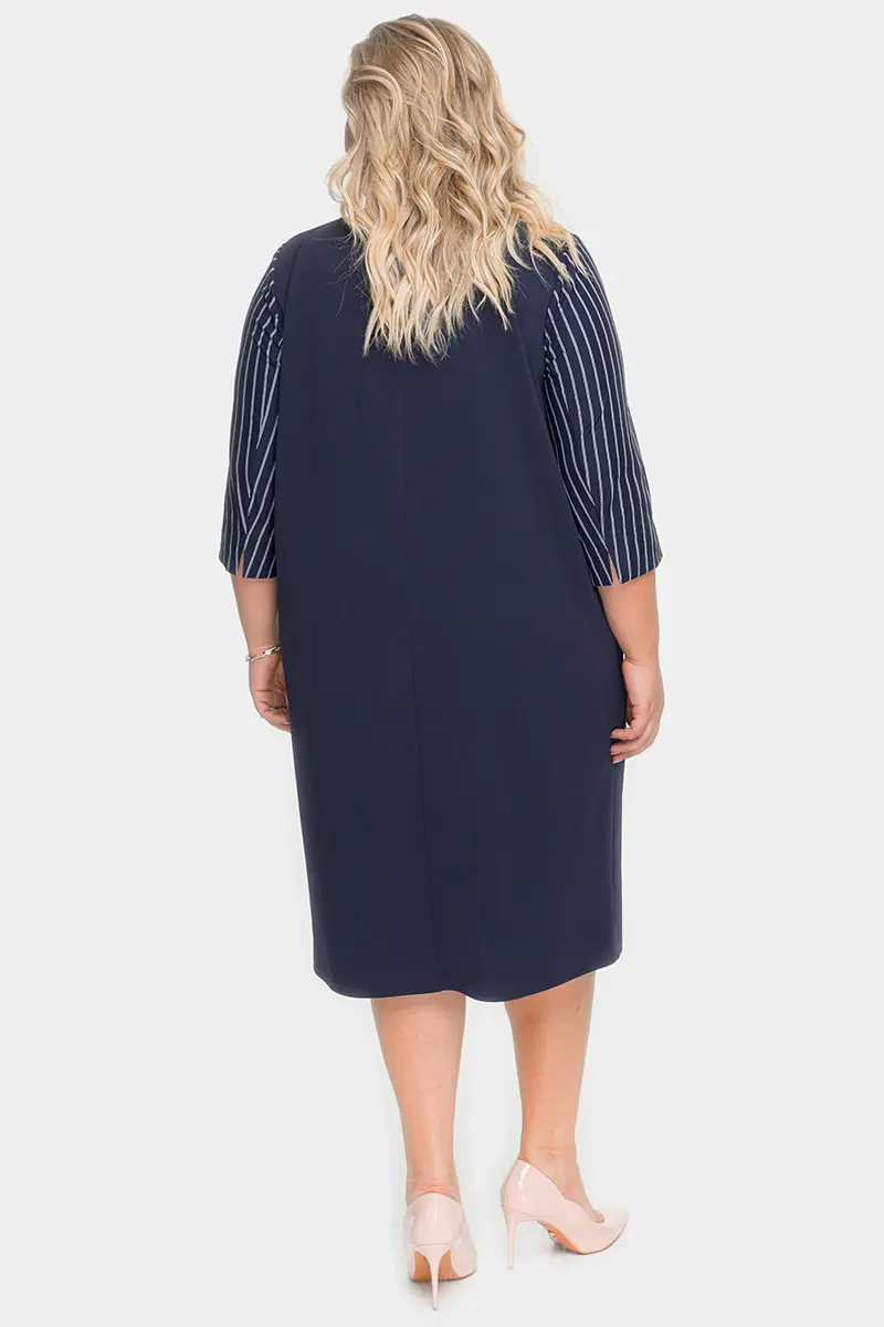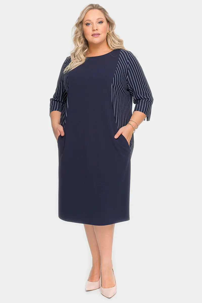 Офисное платье полуприлегающего силуэта. По переду фигурные рельефы, в которых обработаны карманы. Рельефные детали и рукава из ткани-компаньона в полоску.