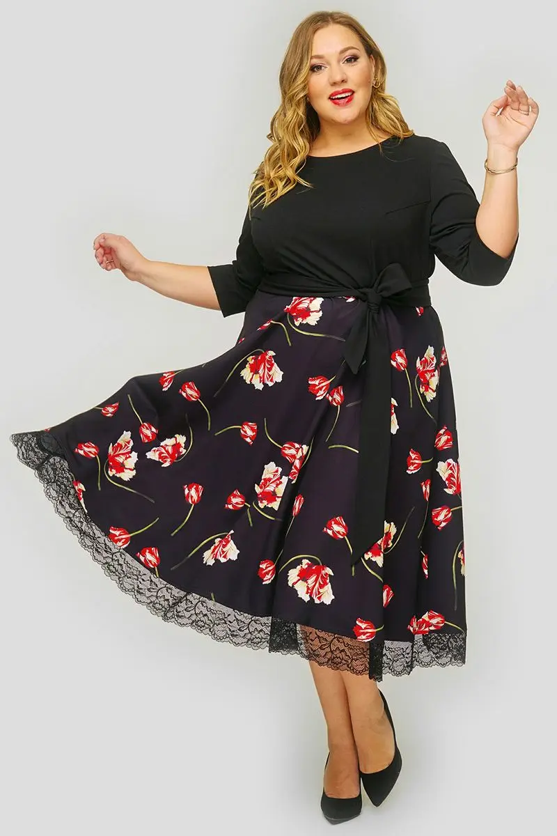 Романтичное платье с отрезной расклешенной юбкой, завязывающееся на пояс. Верх однотон, юбка принт. По низу юбки настрочено нежное кружево с фестонами. Вырез горловины округлый, рукав 3/4.