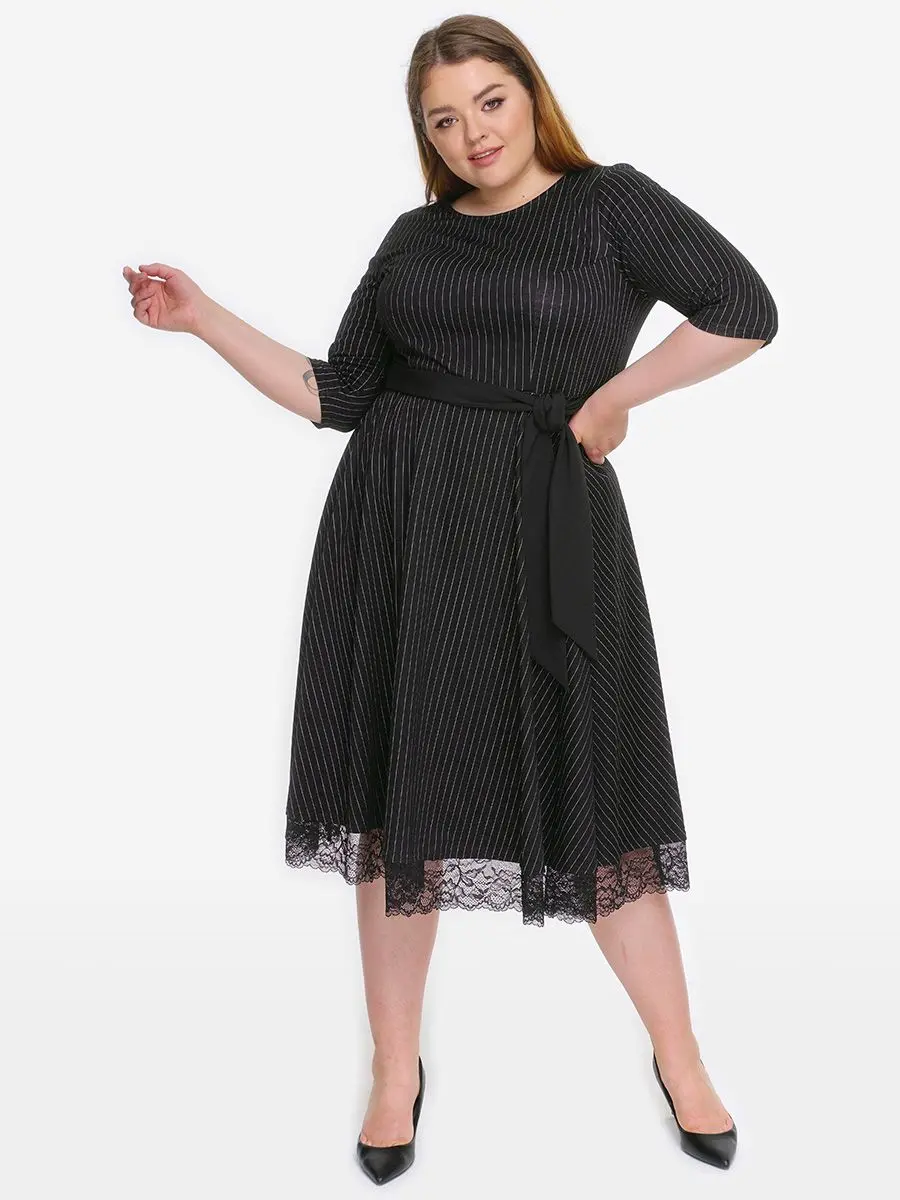 Романтичное платье с отрезной расклешенной юбкой, завязывающееся на пояс. По низу юбки настрочено нежное кружево с фестонами. Вырез горловины округлый, рукав 3/4.