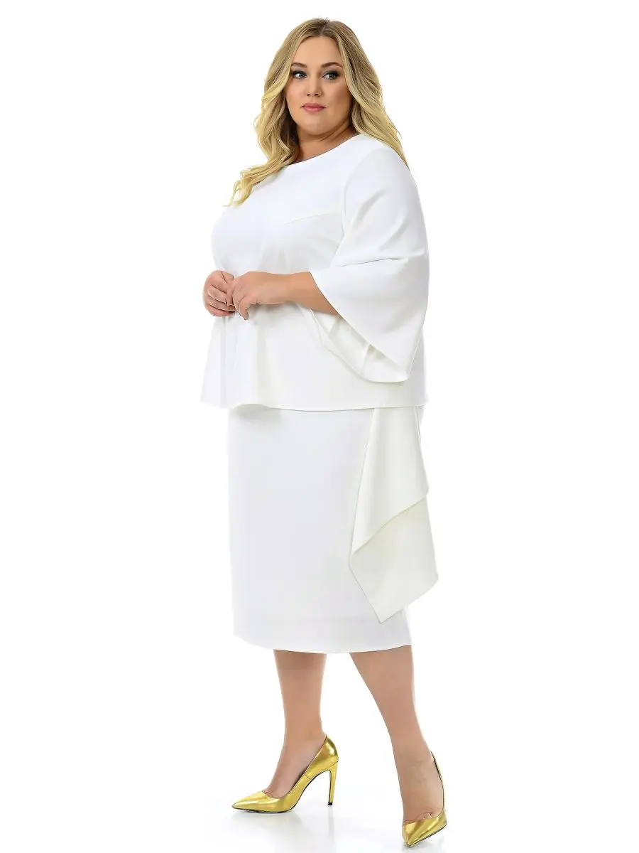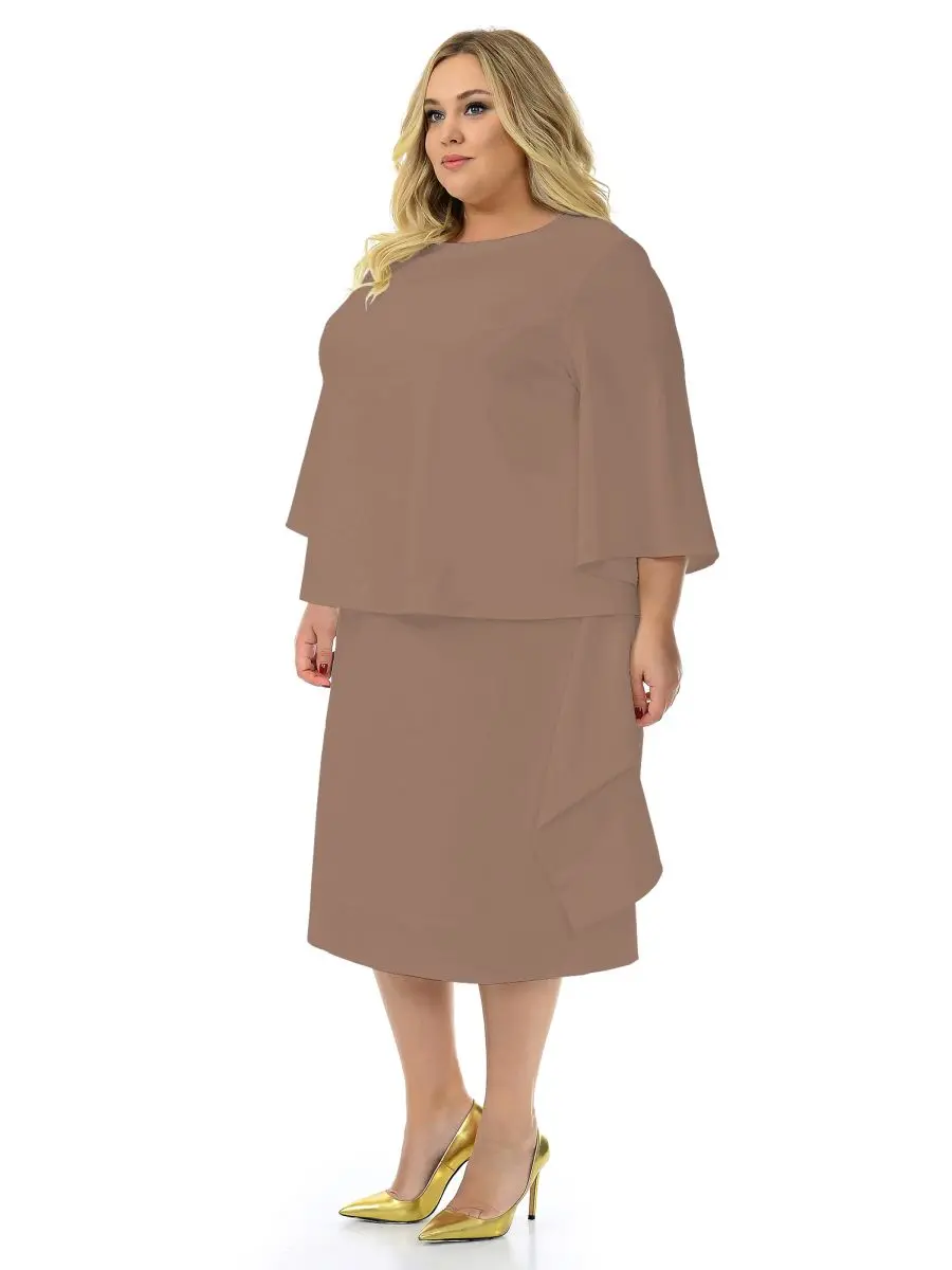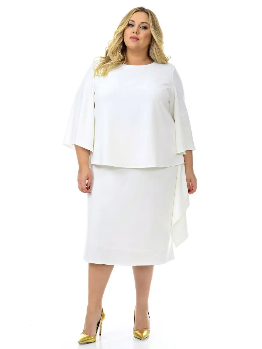 Элегантное платье с эффектом костюма. Нижняя часть(юбка) пришивается к подкладке верхней части. Вырез горловины округлый.