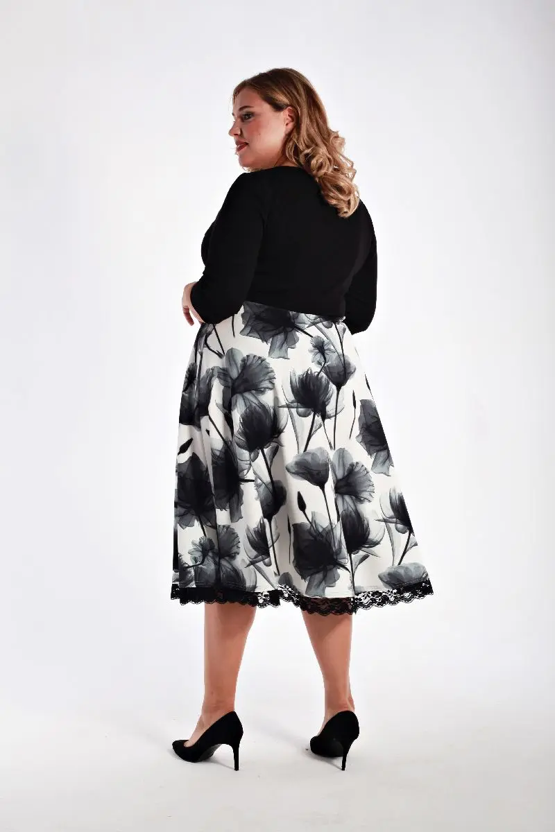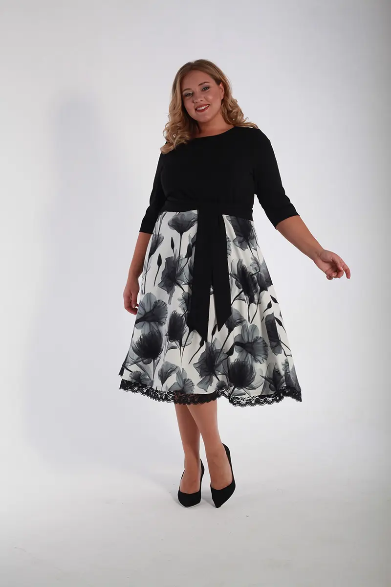 Романтичное платье с отрезной расклешенной юбкой, завязывающееся на пояс. Верх однотон, юбка принт. По низу юбки настрочено нежное кружево с фестонами. Вырез горловины округлый, рукав 3/4.