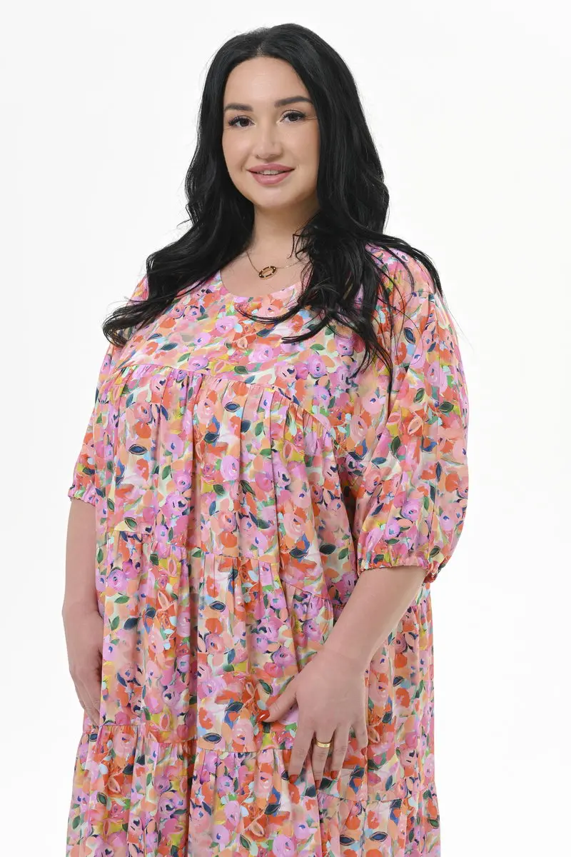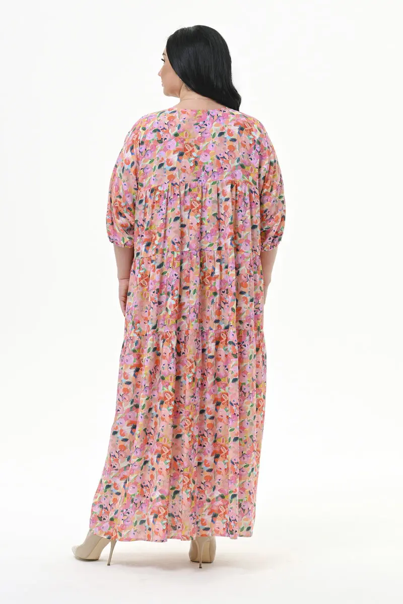 Платье длинное из штапеля свободного силуэта. Отрезное по линии груди, нижняя часть платья присборена. Рукав закрывает локоть, низ рукава на резинке. Вырез горловины округлый.