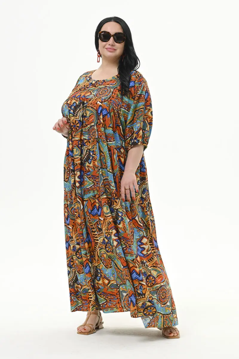 Платье длинное из штапеля свободного силуэта. Отрезное по линии груди, нижняя часть платья присборена. Рукав закрывает локоть, низ рукава на резинке. Вырез горловины округлый.