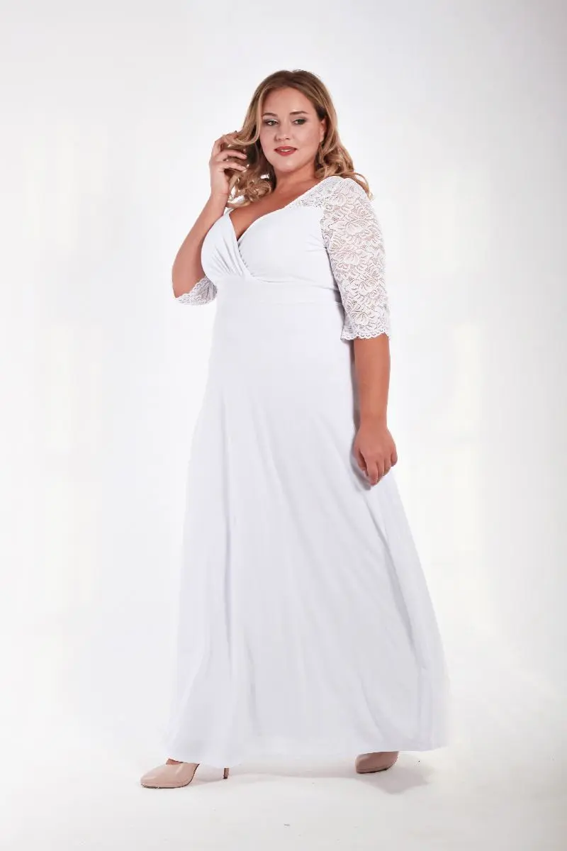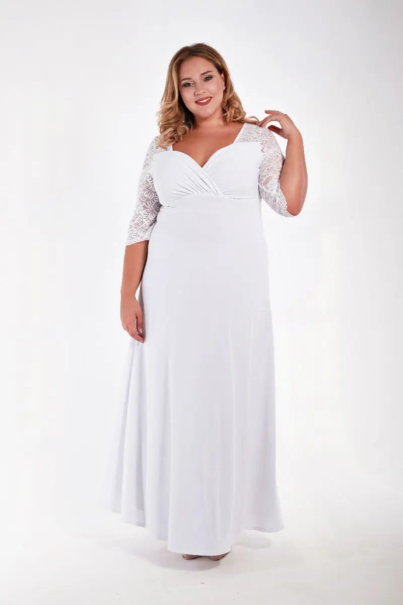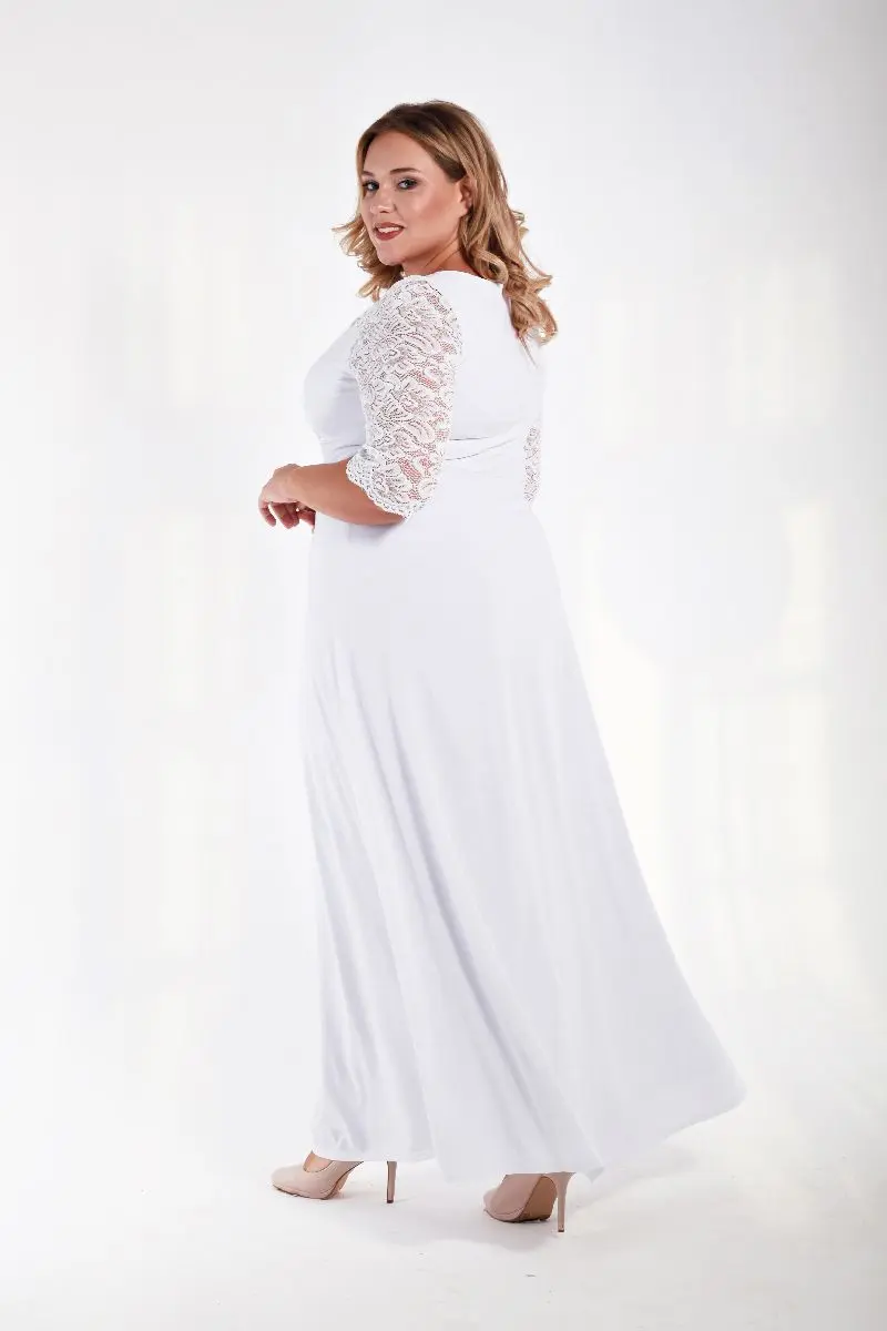 Длинное белое платье из трикотажа.Идеально в качестве свадебного. Верхняя часть переда и - юбка двойные. Кокетки и рукава из кружева.