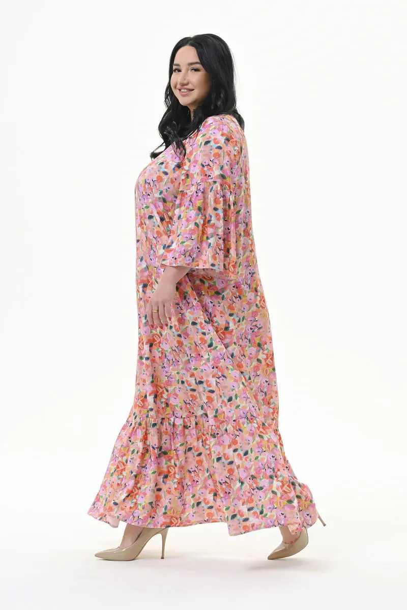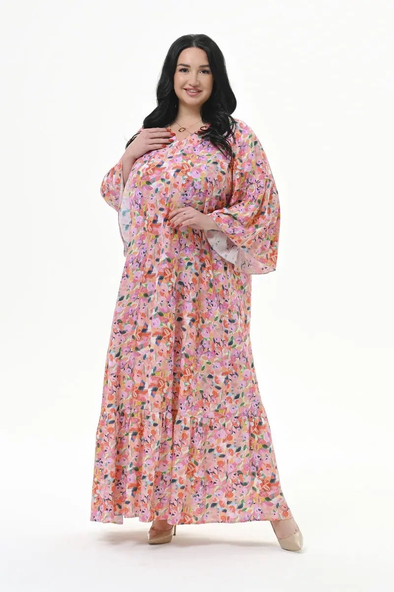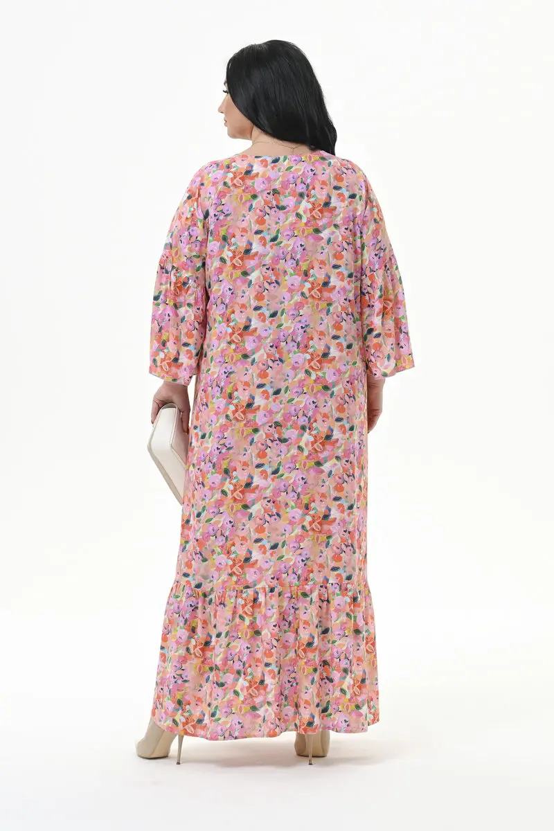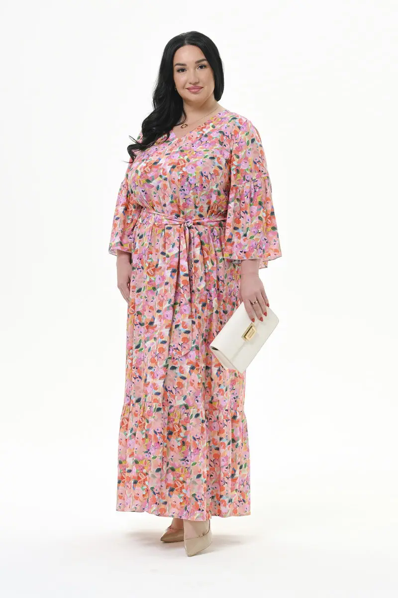 > Платье длинное с V - вырезом и воланом по низу, штапель, принт "розы"